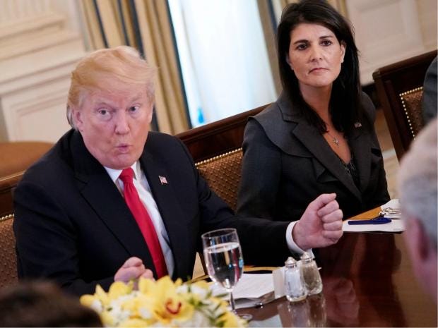 Sources told CNN that Mr Trump was not happy Ms Haley had taken to the popular Sunday morning news talk show circuit to discuss the additional sanctions. The outlet reported that the president “was also annoyed that, to his mind, Europeans weren't taking as much punitive action against Russia”. Ms Haley, who is Indian-American, has long been seen as a 'token' appointment, one of the few women and minorities with a voice in the administration. Experts have said she proved herself professionally at the UN by delivering a strong stance against Russia and repeating the 'company line' on other issues without wavering.