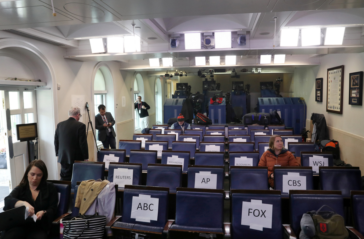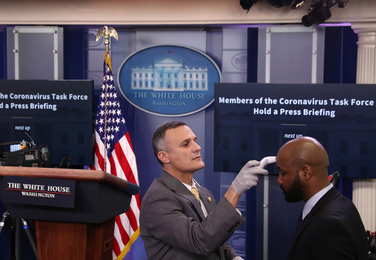 Journalists and staff members had their temperatures taken before entering the complex. Reporters staggered their seating during the news conference, sitting in every other seat in the White House briefing room to implement social distancing measures. The White House has temporarily cut down the number of journalists permitted to come onto the complex on a daily basis.
