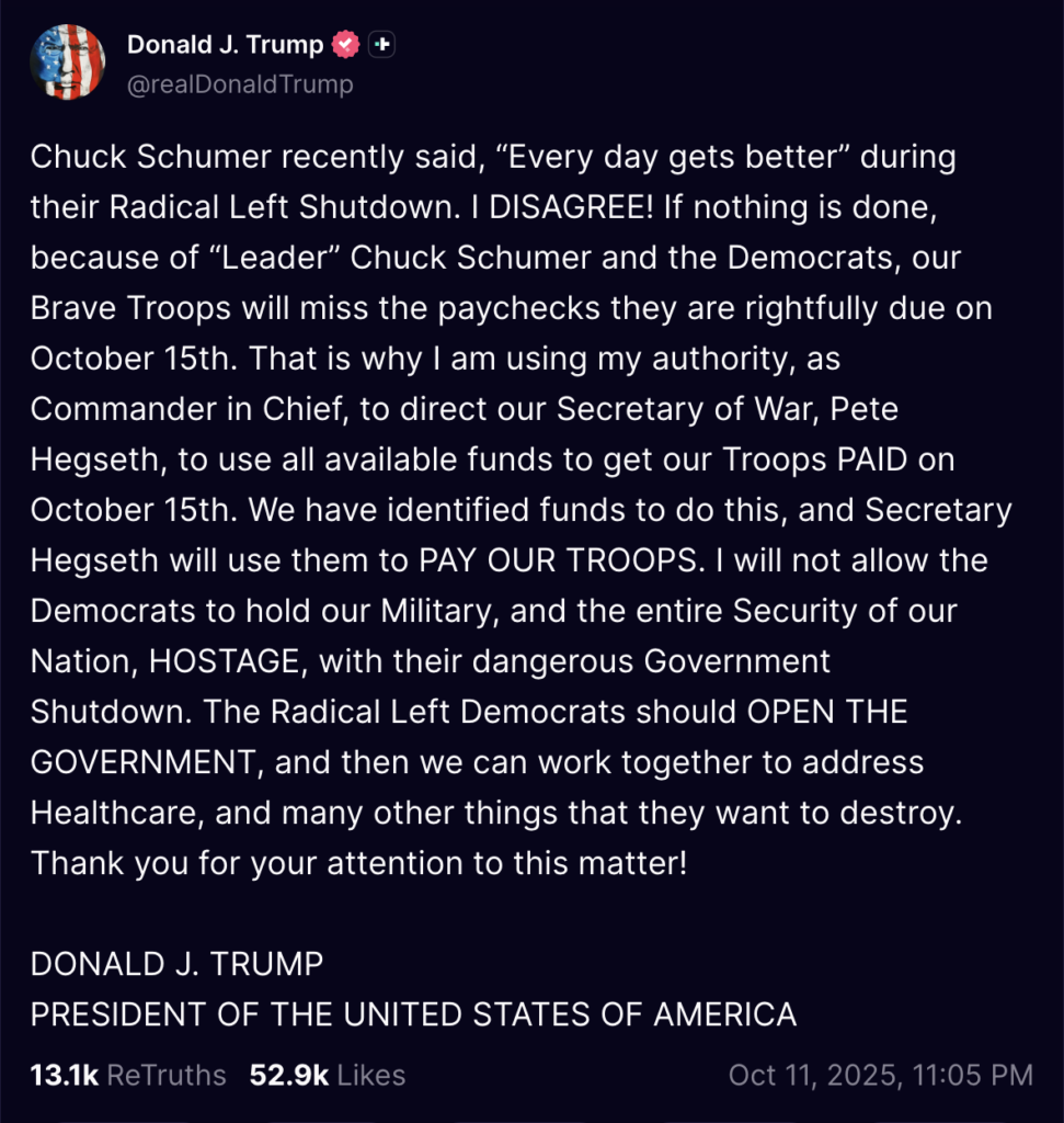 In a post on Truth Social, Trump said he had directed Defense Secretary Pete Hegseth "to use all available funds to get our Troops PAID on October 15th. We have identified funds to do this, and Secretary Hegseth will use them to PAY OUR TROOPS.”
