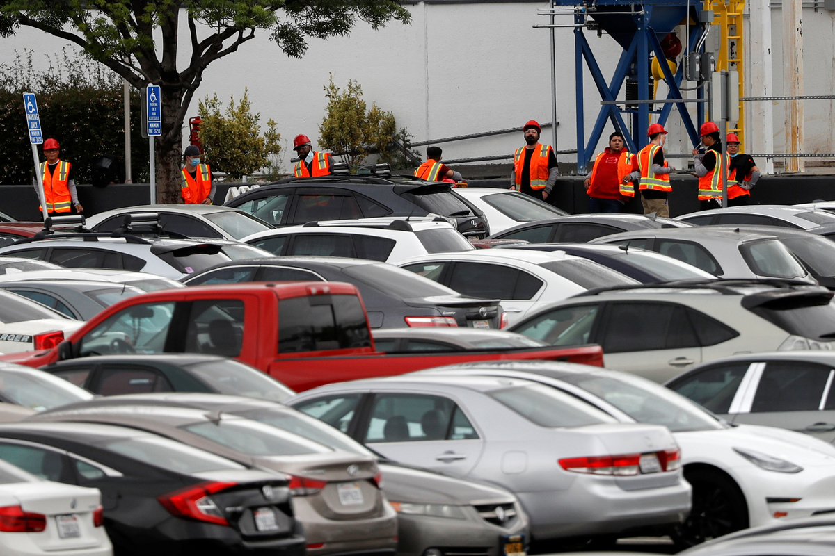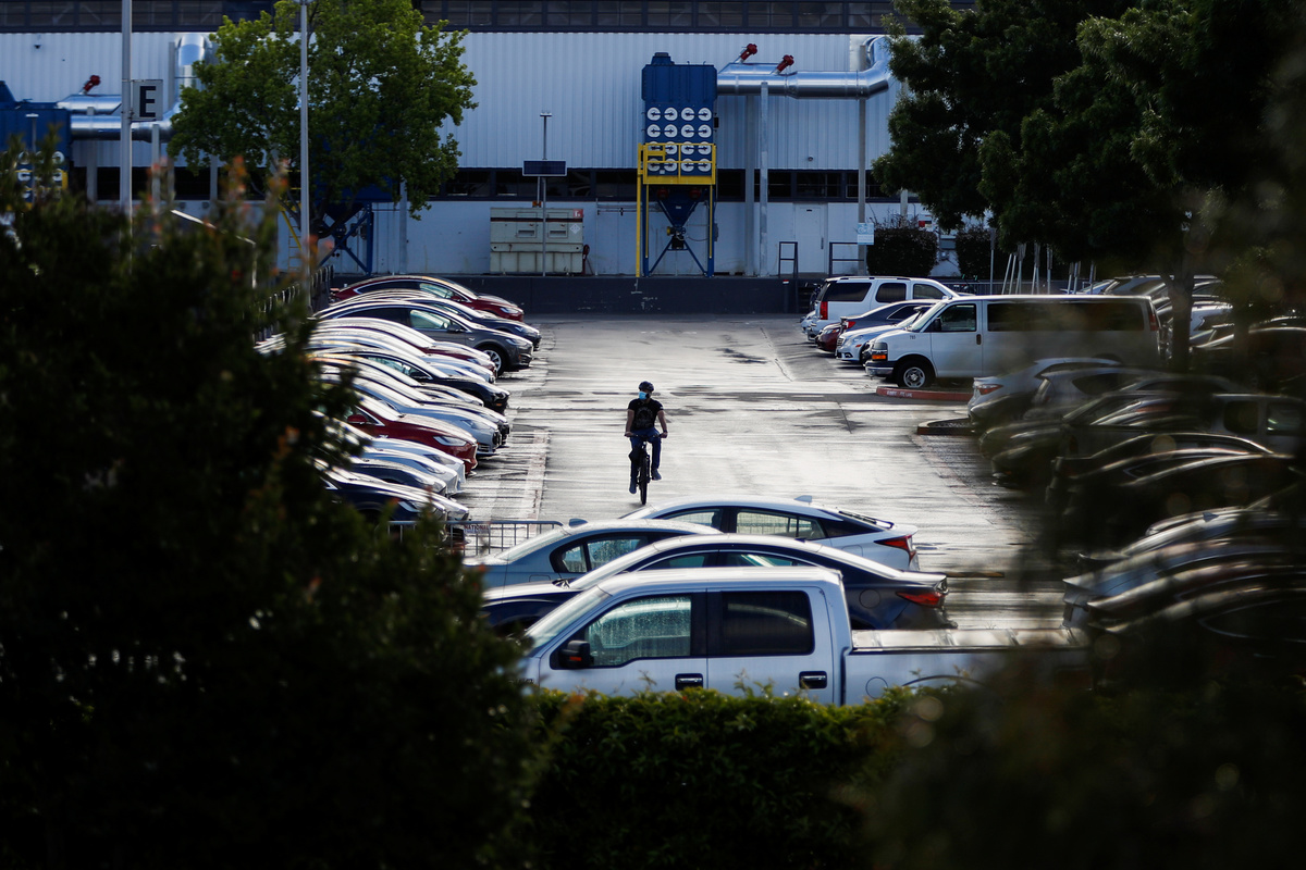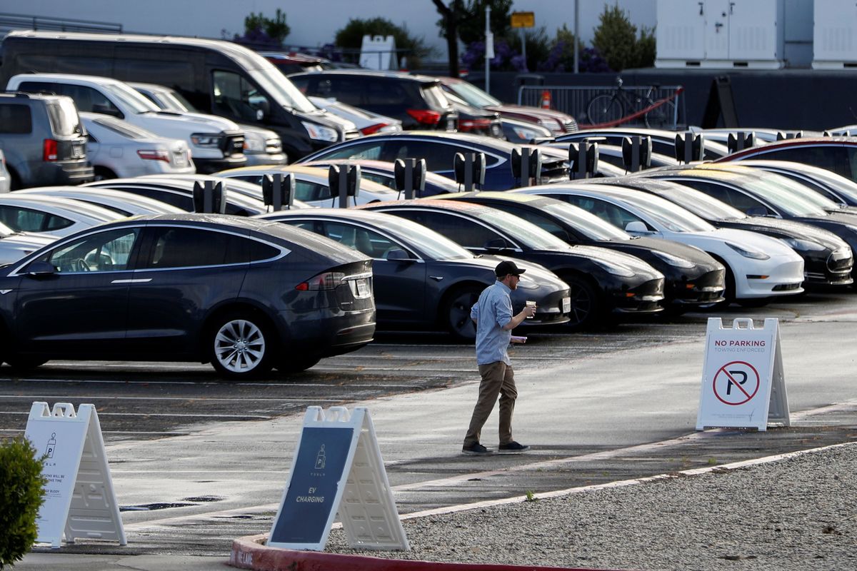 Employee-parking lots at Tesla's factory in Fremont, California were packed with cars on Tuesday. Trucks could be seen driving in and out of the factory grounds.