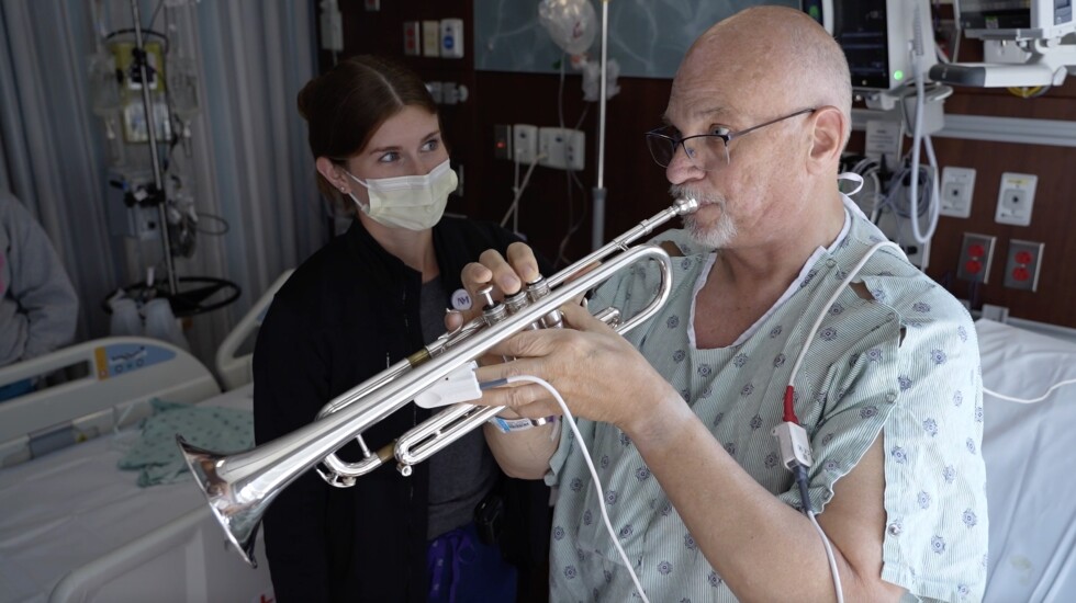 To the amazement of family and staff, the trumpet’s sharp, clear tones filled Spees’ hospital room as he proudly stood — hospital gown and all — and played “Joy to the World.” Spees and his wife shared a hug after the performance as they realized that he didn’t have to give up his passion after all.