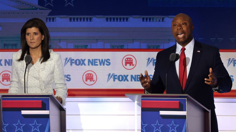 Sen. Tim Scott, one of just three Black U.S. senators, was largely spared any attacks or back-and-forths — and stuck largely to his campaign talking points. He has said he would support “the most conservative legislation, pro-life legislation” that can get to his desk if elected. On the debate stage, Scott said Americans deserve a president who will fight for a 15-week federal abortion ban.