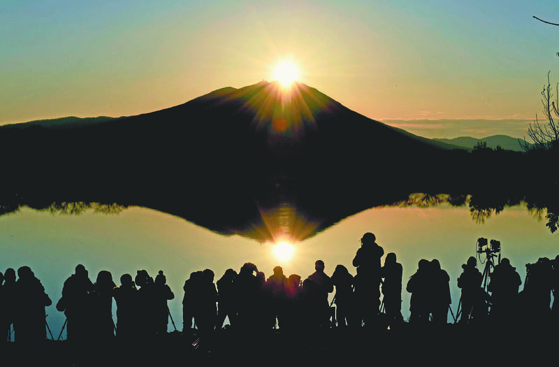 People raise their cameras in Chikusei, Ibaraki Prefecture, as the sun appears atop Mt. Tsukuba on Thursday morning. The "Diamond Tsukuba" phenomenon, occurring before 7 a.m., drew cheers from 650 observers. The spectacular moment can be seen from the Hakojima flood control basin in the city in late October and mid-February every year. On Thursday, a reflection on the surface of the basin created a "Double Diamond Tsukuba" image.