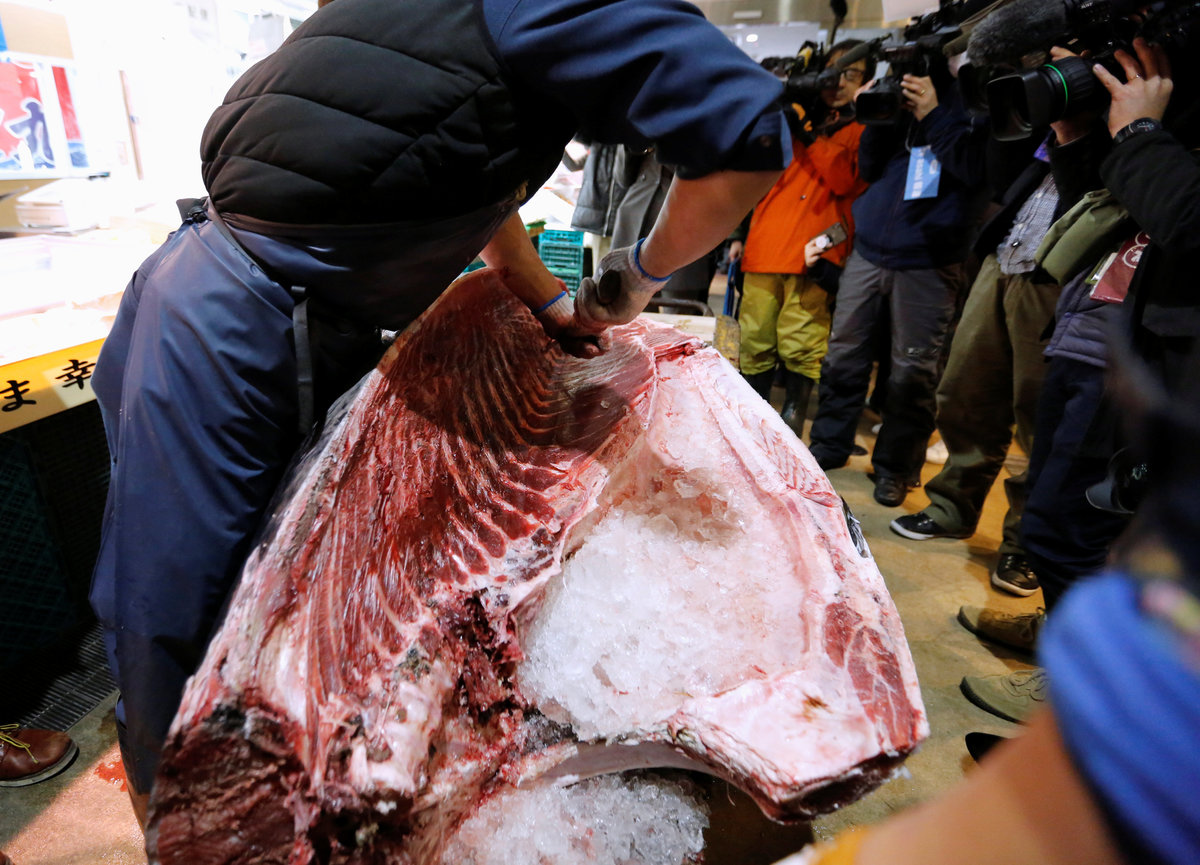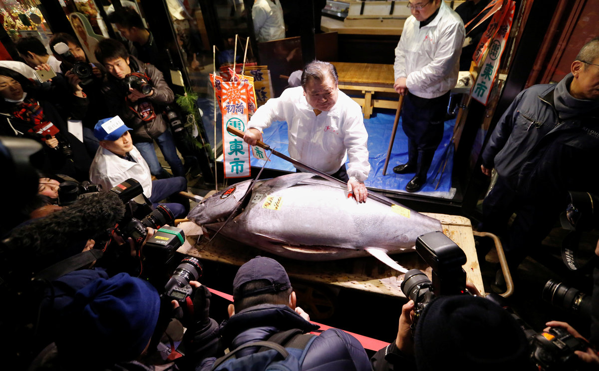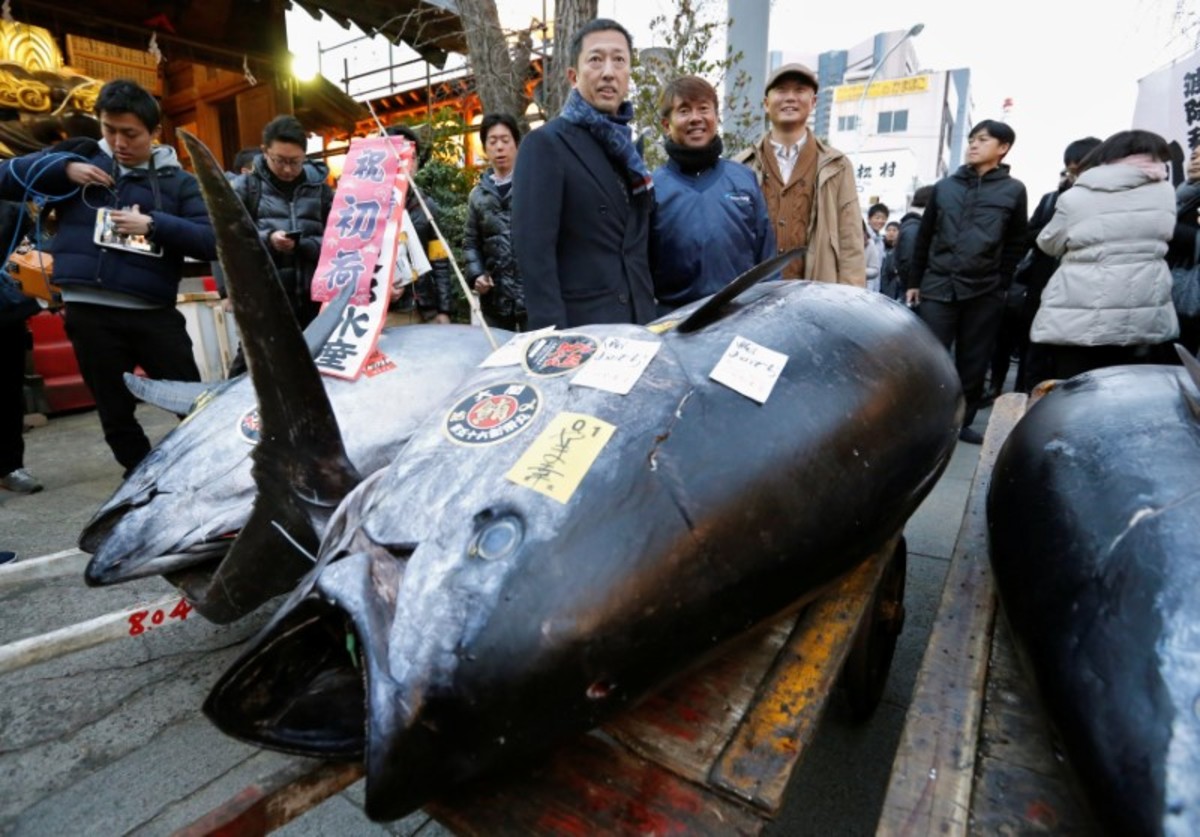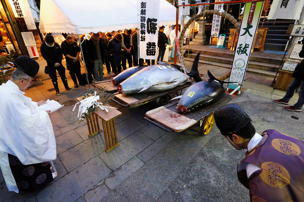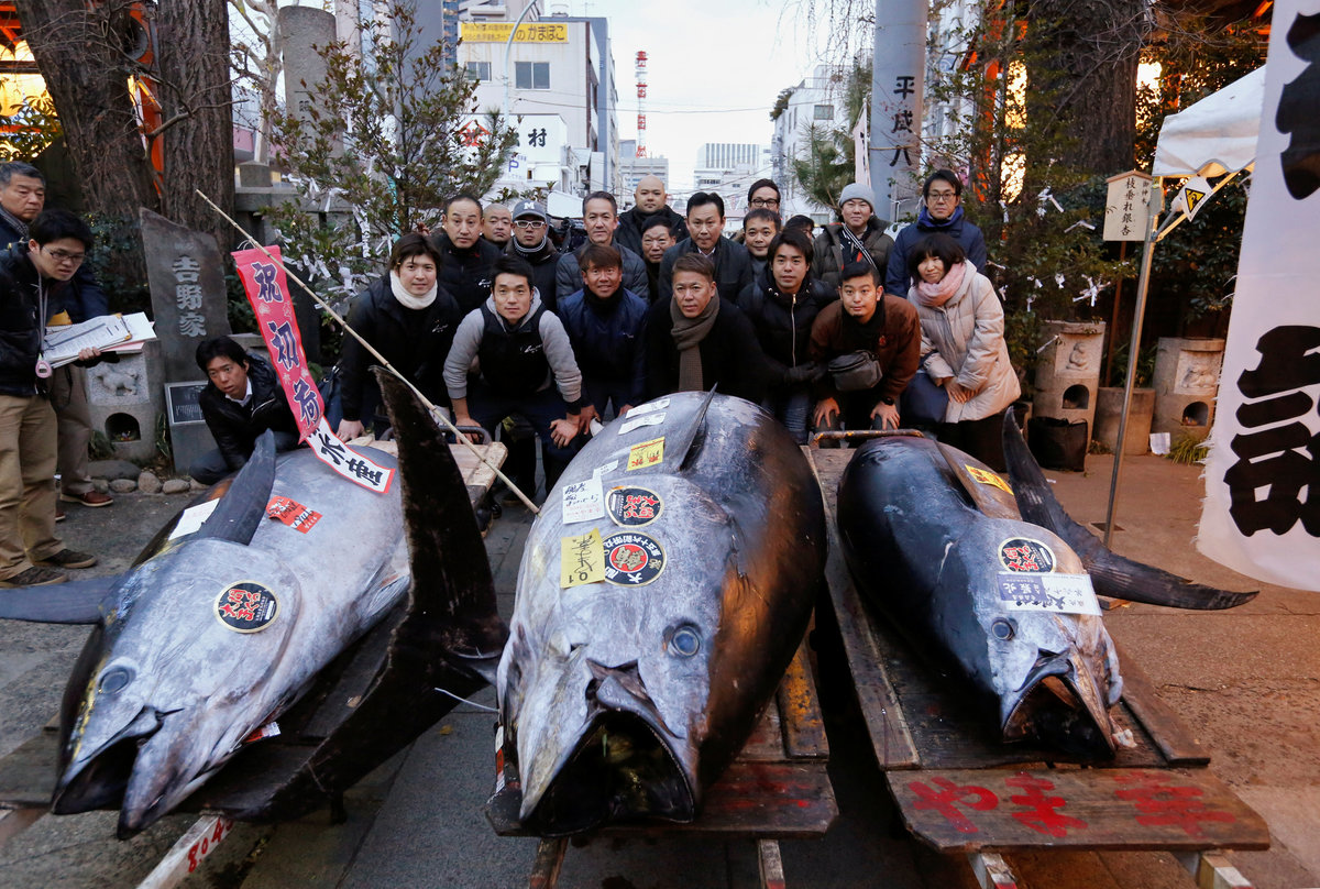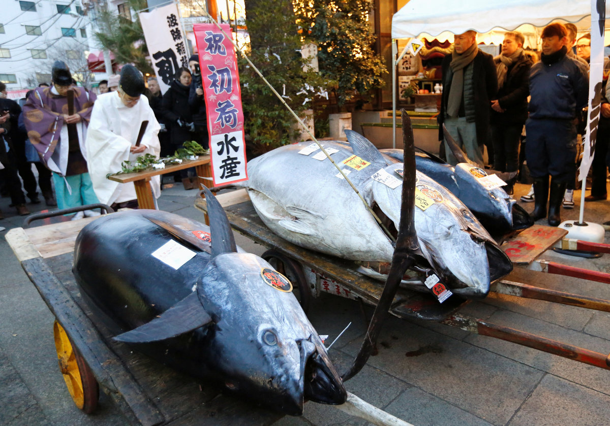 People pose for photos with a 405 kg bluefin tuna (C) and other tuna fish at a shrine outside Tsukiji fish market in Tokyo, Japan, January 5, 2018. REUTERS/Toru HanaiLEOC Co's Chairman, CEO and President Hiroshi Onodera (L of three men in the centre), who runs a chain of sushi restaurants, poses with a 405 kg bluefin tuna outside Tsukiji fish market in Tokyo, Japan, January 5, 2018. REUTERS/Toru HanaiWholesalers check the quality of fresh tuna displayed at the Tsukiji fish market before the New Year's auction in Tokyo, Japan, January 5, 2018. REUTERS/Toru HanaiAn auctioneer raises his hand as he starts the New Year's auction of the frozen tuna at the Tsukiji fish market in Tokyo, Japan, January 5, 2018. REUTERS/Toru HanaiA wholesaler checks the quality of frozen tuna displayed at the Tsukiji fish market before the New Year's auction in Tokyo, Japan, January 5, 2018. REUTERS/Toru HanaiAuctioneers raise their hands as they start the New Year's auction of the frozen tuna while wholesalers check the quality of frozen tuna displayed at the Tsukiji fish market in Tokyo, Japan, January 5, 2018. REUTERS/Toru HanaiWholesalers gather as they check the quality of fresh tuna displayed at the Tsukiji fish market before the New Year's auction in Tokyo, Japan, January 5, 2018. REUTERS/Toru HanaiWholesalers check the quality of fresh tuna displayed at the Tsukiji fish market before the New Year's auction in Tokyo, Japan, January 5, 2018. REUTERS/Toru HanaiWholesalers greet as they check the quality of fresh tuna displayed at the Tsukiji fish market before the New Year's auction in Tokyo, Japan, January 5, 2018. REUTERS/Toru HanaiA wholesaler checks the quality of frozen tuna displayed at the Tsukiji fish market before the New Year's auction in Tokyo, Japan, January 5, 2018. REUTERS/Toru HanaiShinto priests bow in prayer during a Shinto ritual ceremony for a 405 kg bluefin tuna (C) and other tuna fish at a shrine outside Tsukiji fish market in Tokyo, Japan, January 5, 2018. REUTERS/Toru HanaiA 405 kg bluefin tuna (C) is seen at a shrine outside Tsukiji fish market in Tokyo, Japan, January 5, 2018. REUTERS/Toru HanaiShinto priests bow in prayer during a Shinto ritual ceremony for a 405 kg bluefin tuna (C) and other tuna fish at a shrine outside Tsukiji fish market in Tokyo, Japan, January 5, 2018. REUTERS/Toru HanaiA wholesaler checks the quality of a fresh tuna displayed at the Tsukiji fish market before the New Year's auction in Tokyo, Japan, January 5, 2018. REUTERS/Toru HanaiFishmongers hold a 405 kg bluefin tuna as they cut it in front of their store outside Tsukiji fish market in Tokyo, Japan, January 5, 2018. REUTERS/Toru Hanai