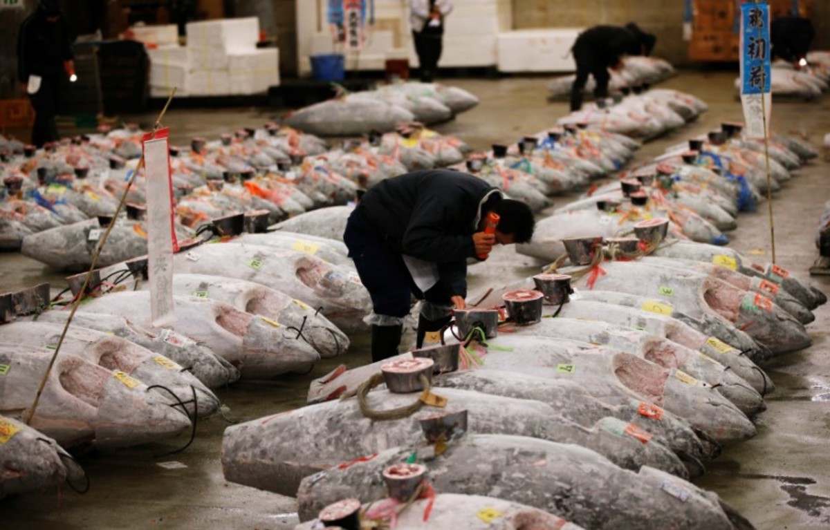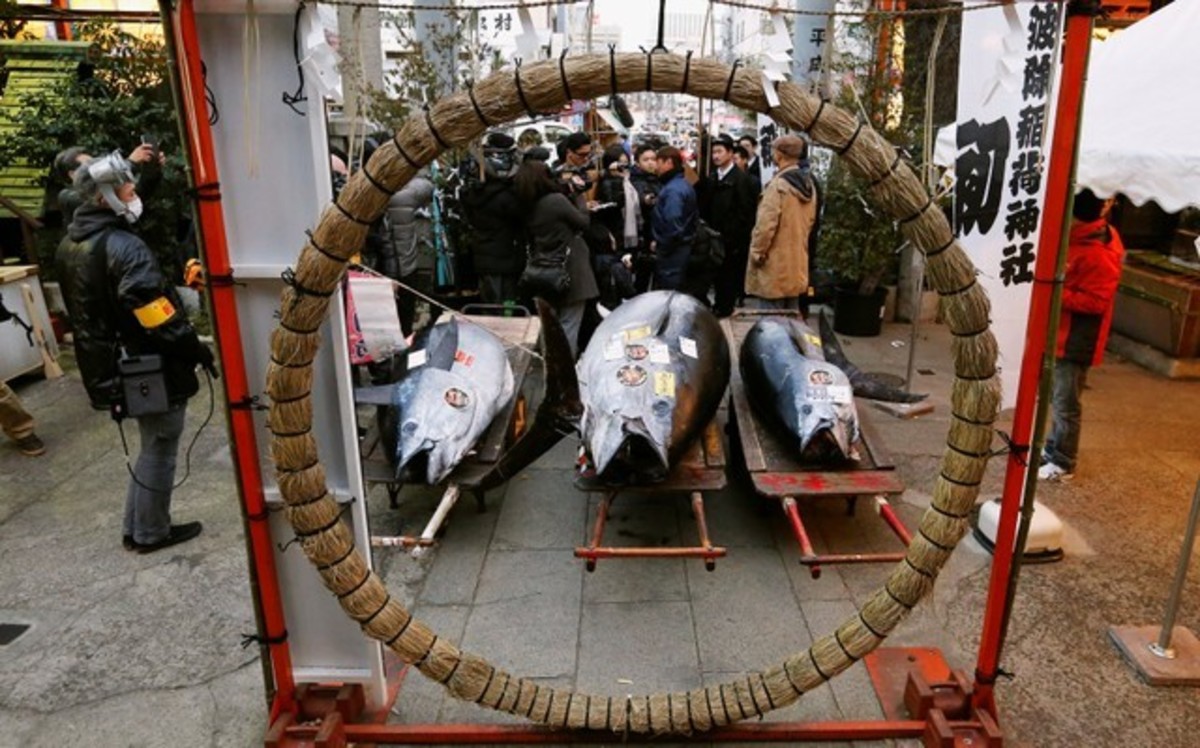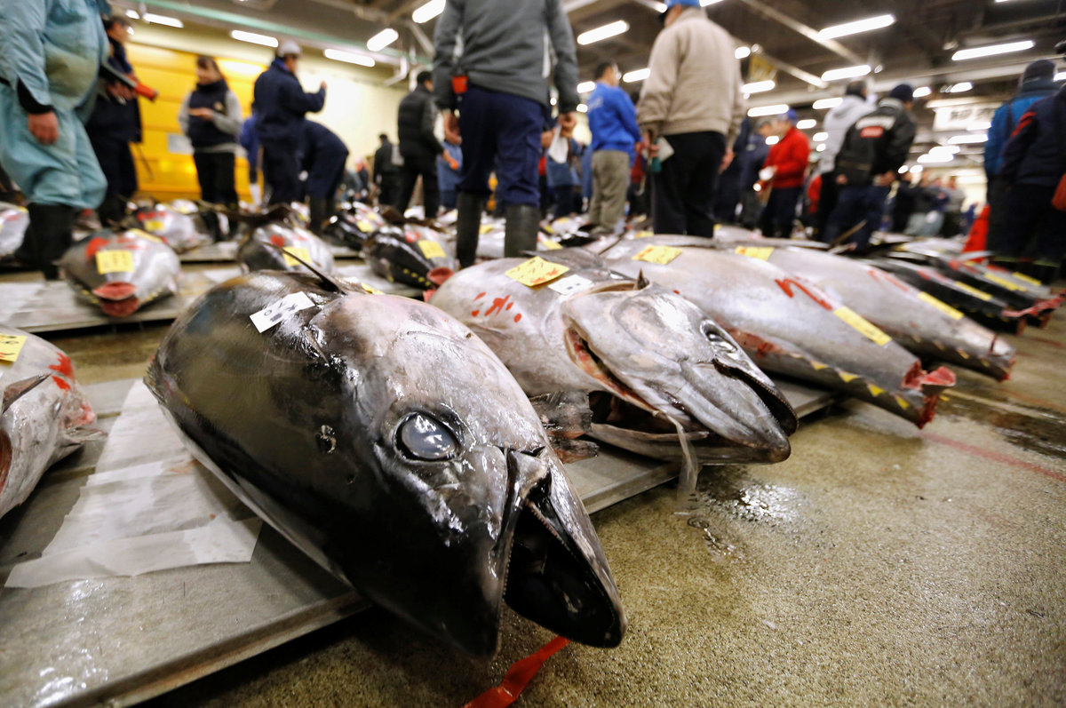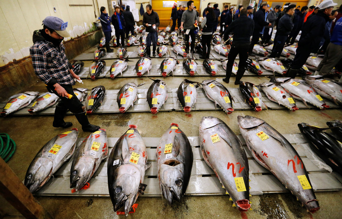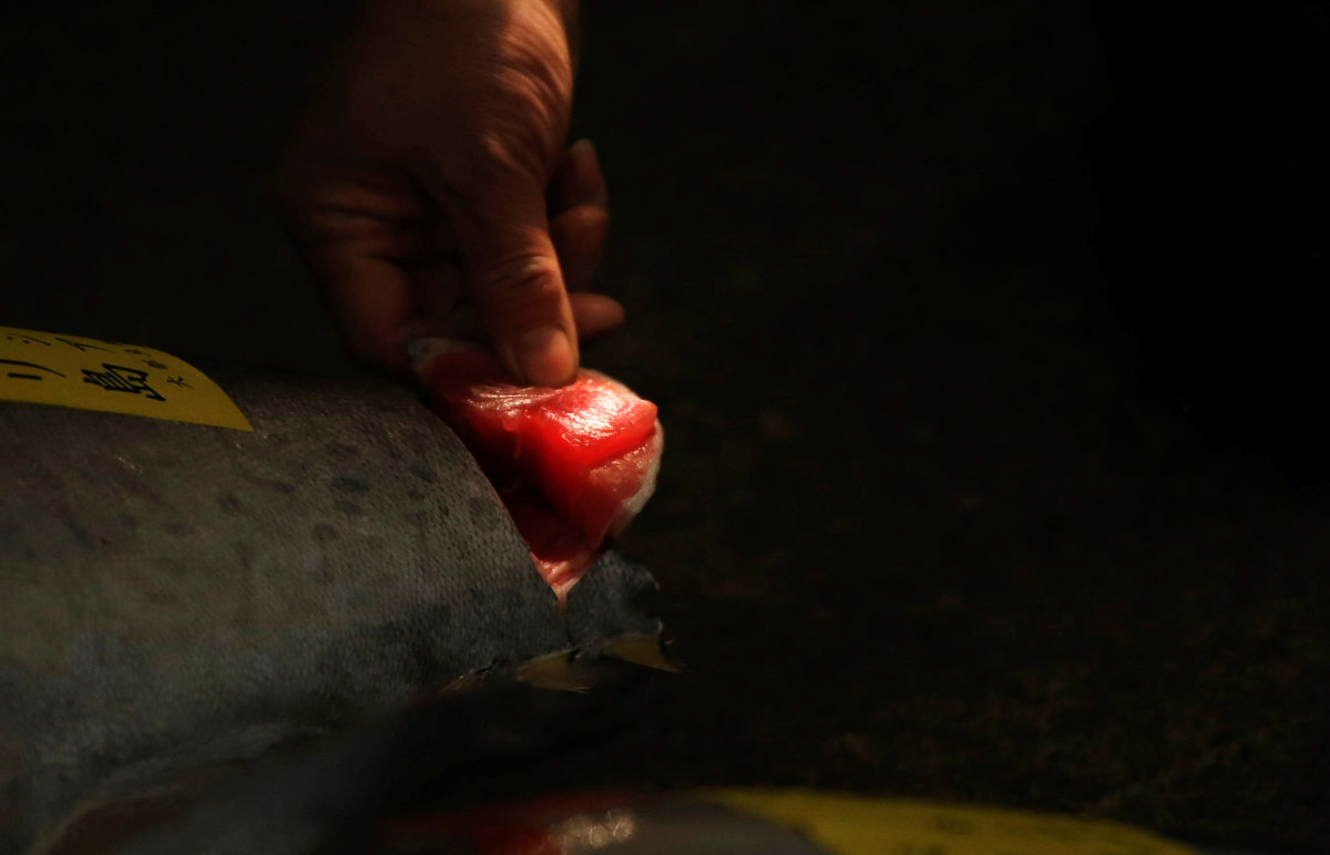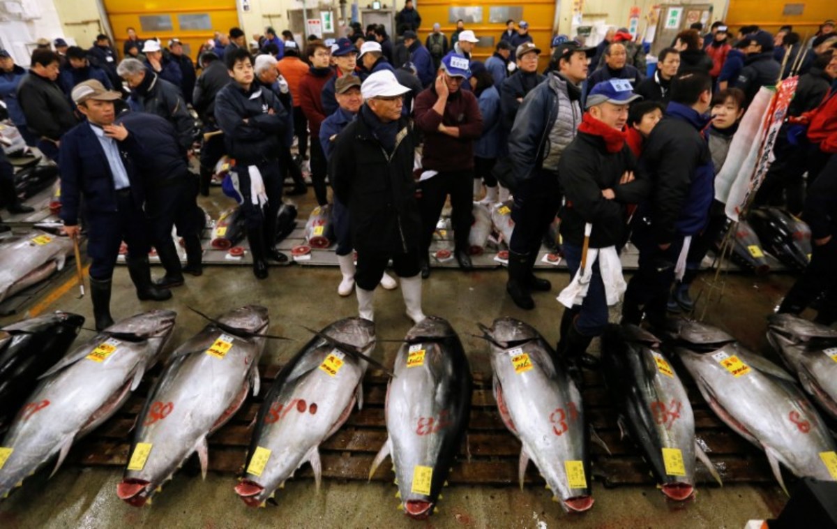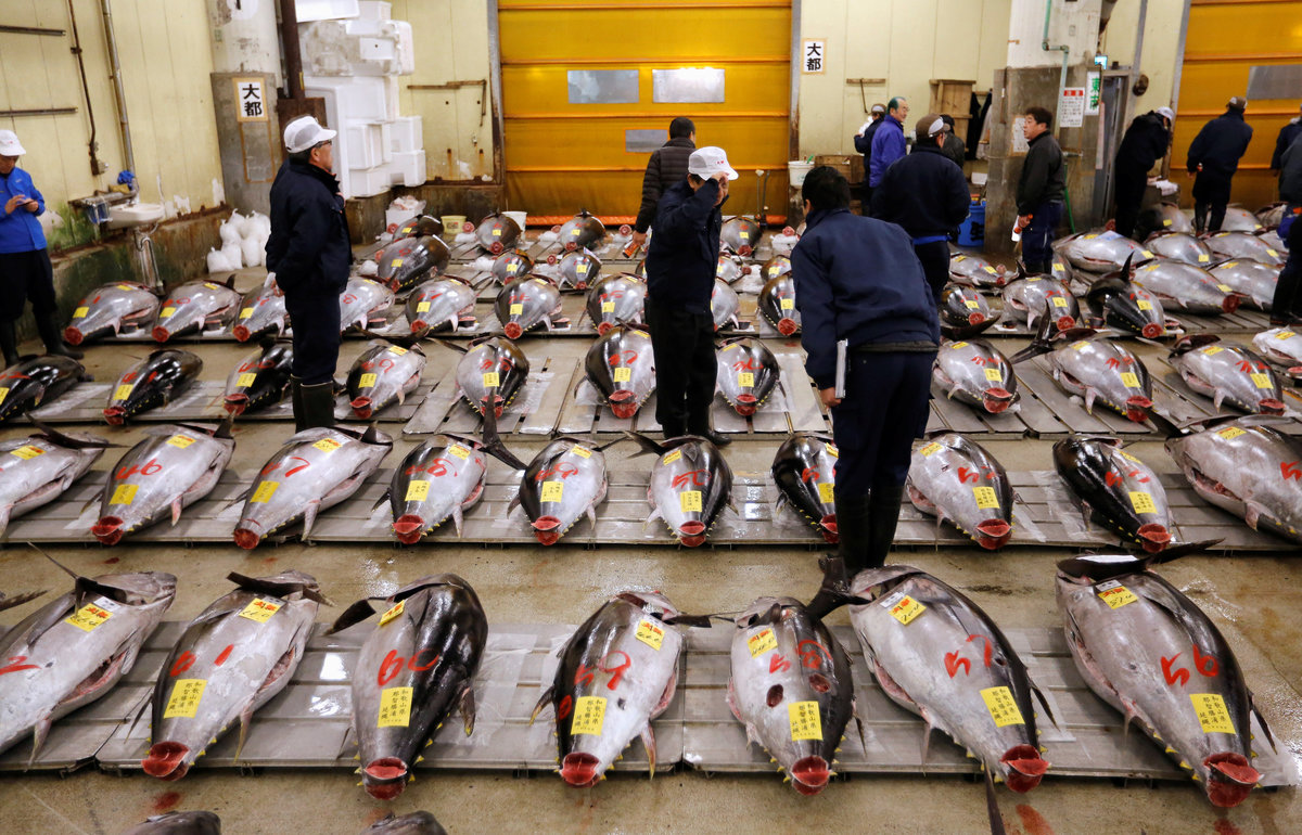 People pose for photos with a 405 kg bluefin tuna (C) and other tuna fish at a shrine outside Tsukiji fish market in Tokyo, Japan, January 5, 2018. REUTERS/Toru HanaiLEOC Co's Chairman, CEO and President Hiroshi Onodera (L of three men in the centre), who runs a chain of sushi restaurants, poses with a 405 kg bluefin tuna outside Tsukiji fish market in Tokyo, Japan, January 5, 2018. REUTERS/Toru HanaiWholesalers check the quality of fresh tuna displayed at the Tsukiji fish market before the New Year's auction in Tokyo, Japan, January 5, 2018. REUTERS/Toru HanaiAn auctioneer raises his hand as he starts the New Year's auction of the frozen tuna at the Tsukiji fish market in Tokyo, Japan, January 5, 2018. REUTERS/Toru HanaiA wholesaler checks the quality of frozen tuna displayed at the Tsukiji fish market before the New Year's auction in Tokyo, Japan, January 5, 2018. REUTERS/Toru HanaiAuctioneers raise their hands as they start the New Year's auction of the frozen tuna while wholesalers check the quality of frozen tuna displayed at the Tsukiji fish market in Tokyo, Japan, January 5, 2018. REUTERS/Toru HanaiWholesalers gather as they check the quality of fresh tuna displayed at the Tsukiji fish market before the New Year's auction in Tokyo, Japan, January 5, 2018. REUTERS/Toru HanaiWholesalers check the quality of fresh tuna displayed at the Tsukiji fish market before the New Year's auction in Tokyo, Japan, January 5, 2018. REUTERS/Toru HanaiWholesalers greet as they check the quality of fresh tuna displayed at the Tsukiji fish market before the New Year's auction in Tokyo, Japan, January 5, 2018. REUTERS/Toru HanaiA wholesaler checks the quality of frozen tuna displayed at the Tsukiji fish market before the New Year's auction in Tokyo, Japan, January 5, 2018. REUTERS/Toru HanaiShinto priests bow in prayer during a Shinto ritual ceremony for a 405 kg bluefin tuna (C) and other tuna fish at a shrine outside Tsukiji fish market in Tokyo, Japan, January 5, 2018. REUTERS/Toru HanaiA 405 kg bluefin tuna (C) is seen at a shrine outside Tsukiji fish market in Tokyo, Japan, January 5, 2018. REUTERS/Toru HanaiShinto priests bow in prayer during a Shinto ritual ceremony for a 405 kg bluefin tuna (C) and other tuna fish at a shrine outside Tsukiji fish market in Tokyo, Japan, January 5, 2018. REUTERS/Toru HanaiA wholesaler checks the quality of a fresh tuna displayed at the Tsukiji fish market before the New Year's auction in Tokyo, Japan, January 5, 2018. REUTERS/Toru HanaiFishmongers hold a 405 kg bluefin tuna as they cut it in front of their store outside Tsukiji fish market in Tokyo, Japan, January 5, 2018. REUTERS/Toru Hanai