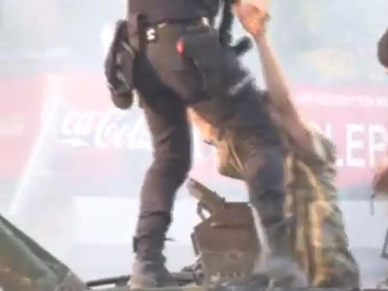 The anonymous policeman, wearing a gas mask and carrying a rifle, then helped the man down.
