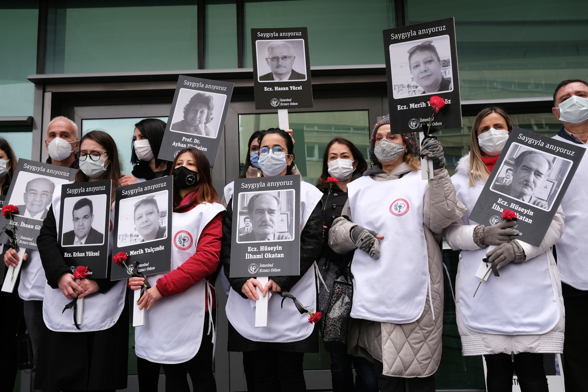 FILE PHOTO: Healthcare workers hold carnations and pictures of their colleagues who have passed away due to the coronavirus disease (COVID-19) outbreak, during a demonstration to mark the first anniversary of the first coronavirus diagnosis in Turkey, in front of the Prof. Dr. Cemil Tascioglu City Hospital in Istanbul, Turkey March 11, 2021. REUTERS/Murad Sezer/File Photo