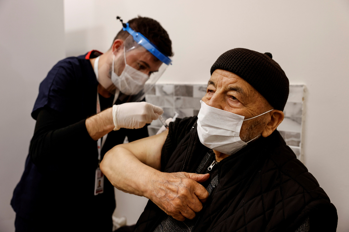 FILE PHOTO: Hasan Oz receives a shot of the Sinovac's CoronaVac COVID-19 vaccine as nationwide vaccination began for seniors of 80 years old or older at Sancaktepe Education and Research Hospital, in Istanbul, Turkey, January 27, 2021. REUTERS/Umit Bektas/File Photo