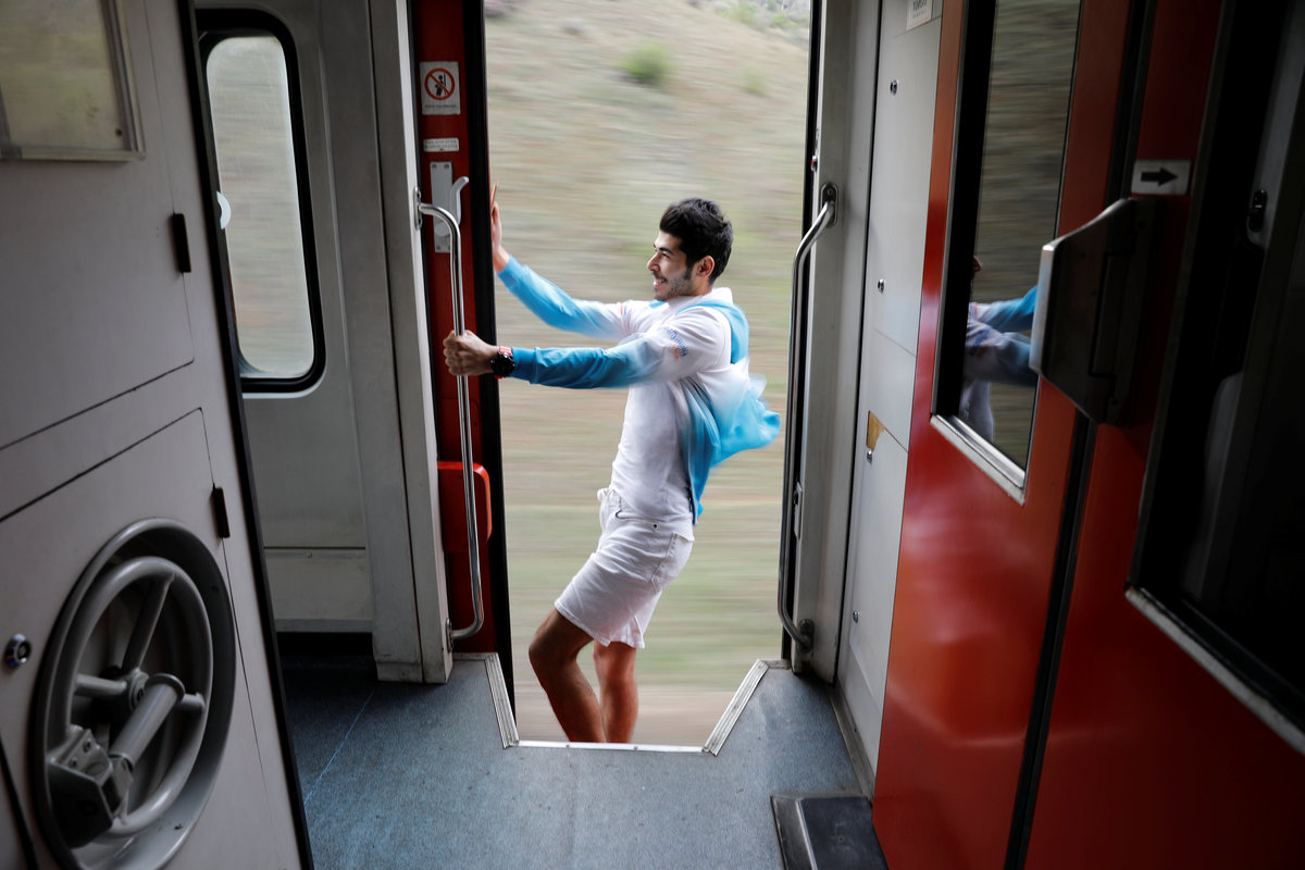 Sinan Usta, 24, poses for a selfie as he stands on the steps of an open door on the Eastern Express as it travels through Erzincan province en route from Ankara to Kars, Turkey, April 10, 2018. Sinan decorated the wagon with candles and rainbow coloured flashing lights for his girlfriend. "We had this journey planned months ago. But my girlfriend's family didn't allow her," he said. "I don't like leaving things unfinished, so I took the train anyway." REUTERS/Umit Bektas