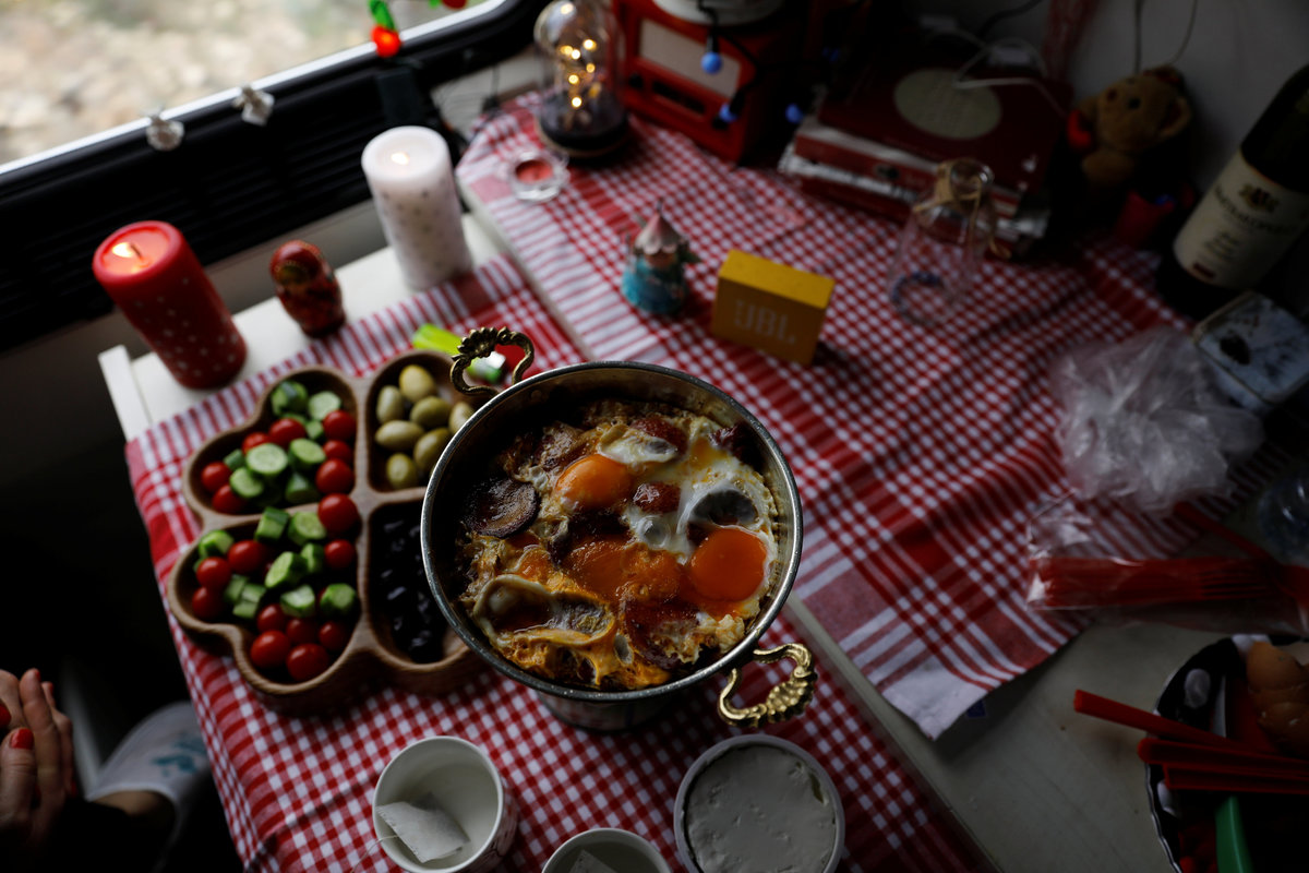Breakfast prepared by Vasfiye Filiz, 43, and Nurcan Guner, 40, is placed on a table on board the Eastern Express travelling through Erzincan province en route from Ankara to Kars, eastern Turkey, April 10, 2018. REUTERS/Umit Bektas