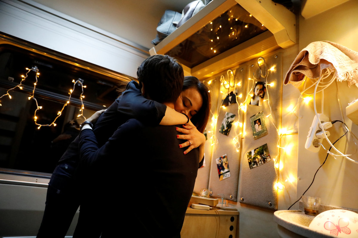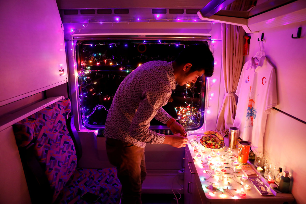 University student Sinan Usta, 24, decorates his compartment with candles and lights as the Eastern Express travels through Kayseri province en route from Ankara to Kars, Turkey, April 9, 2018. Sinan decorated the wagon with candles and rainbow coloured flashing lights for his girlfriend. "We had this journey planned months ago. But my girlfriend's family didn't allow her," he said. "I don't like leaving things unfinished, so I took the train anyway." REUTERS/Umit Bektas