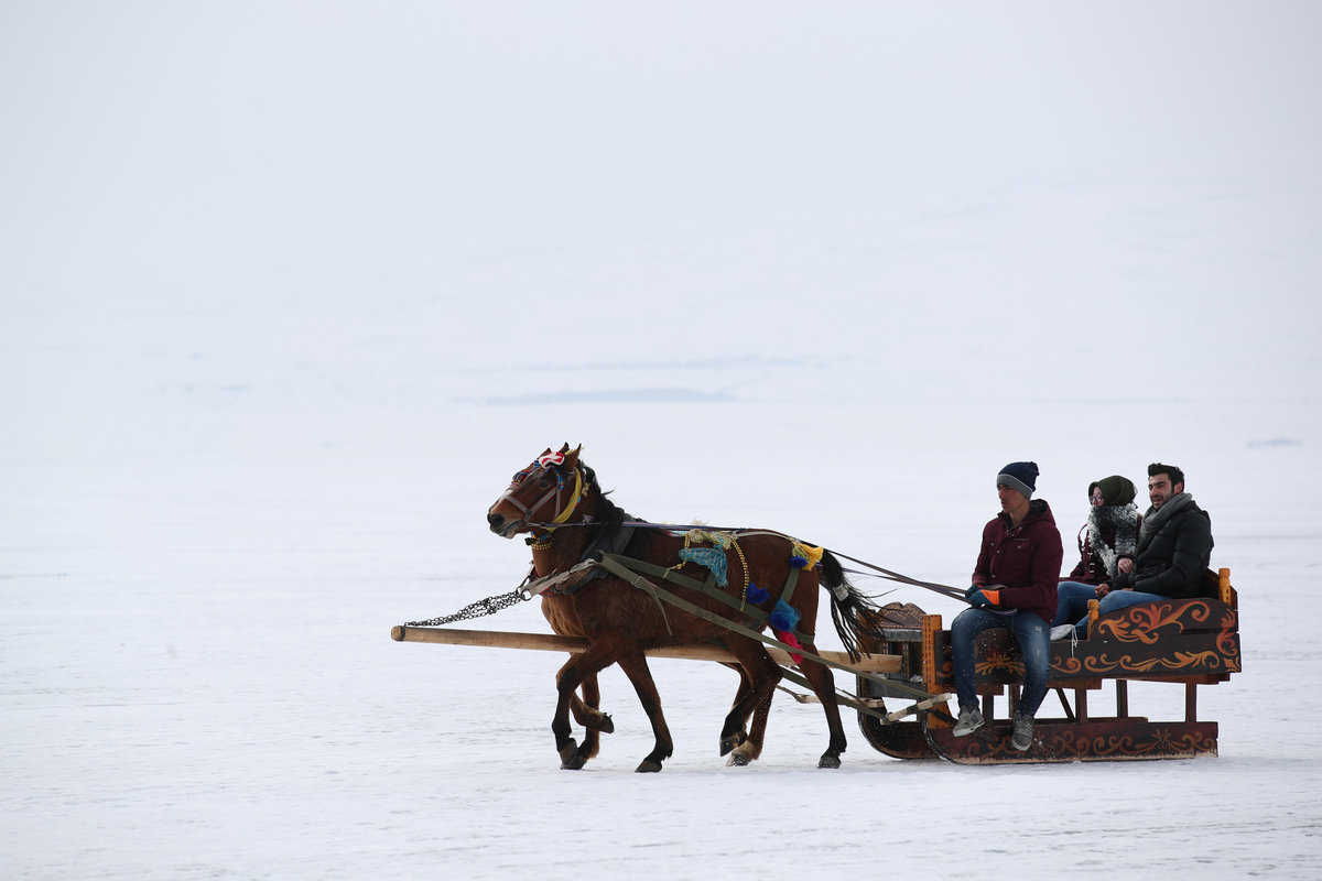 A man rides a horse-drawn carriage on the frozen lake Cildir, in Kars province, Turkey, February 9, 2018. REUTERS/Umit Bektas