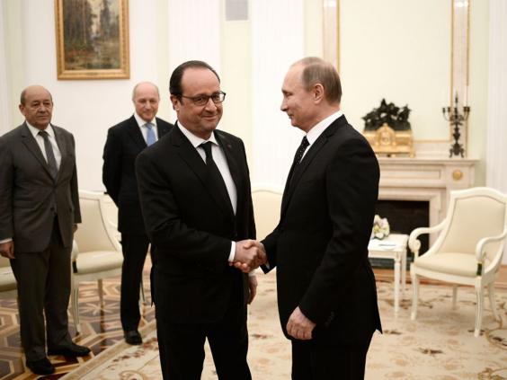 Mr Putin has pledged to “co-operate” in the battle against Isis with the French President François Hollande as he welcomed him for talks at the Kremlin in the wake of terror attacks in Paris. Mr Hollande said that all sides had to create a “broad coalition” to destroy Isis and seek a political solution in Syria. However, hopes of any formal coalition between Moscow and the West appeared thin.