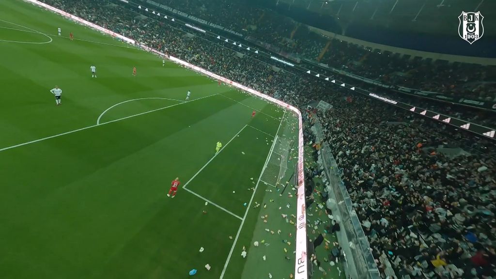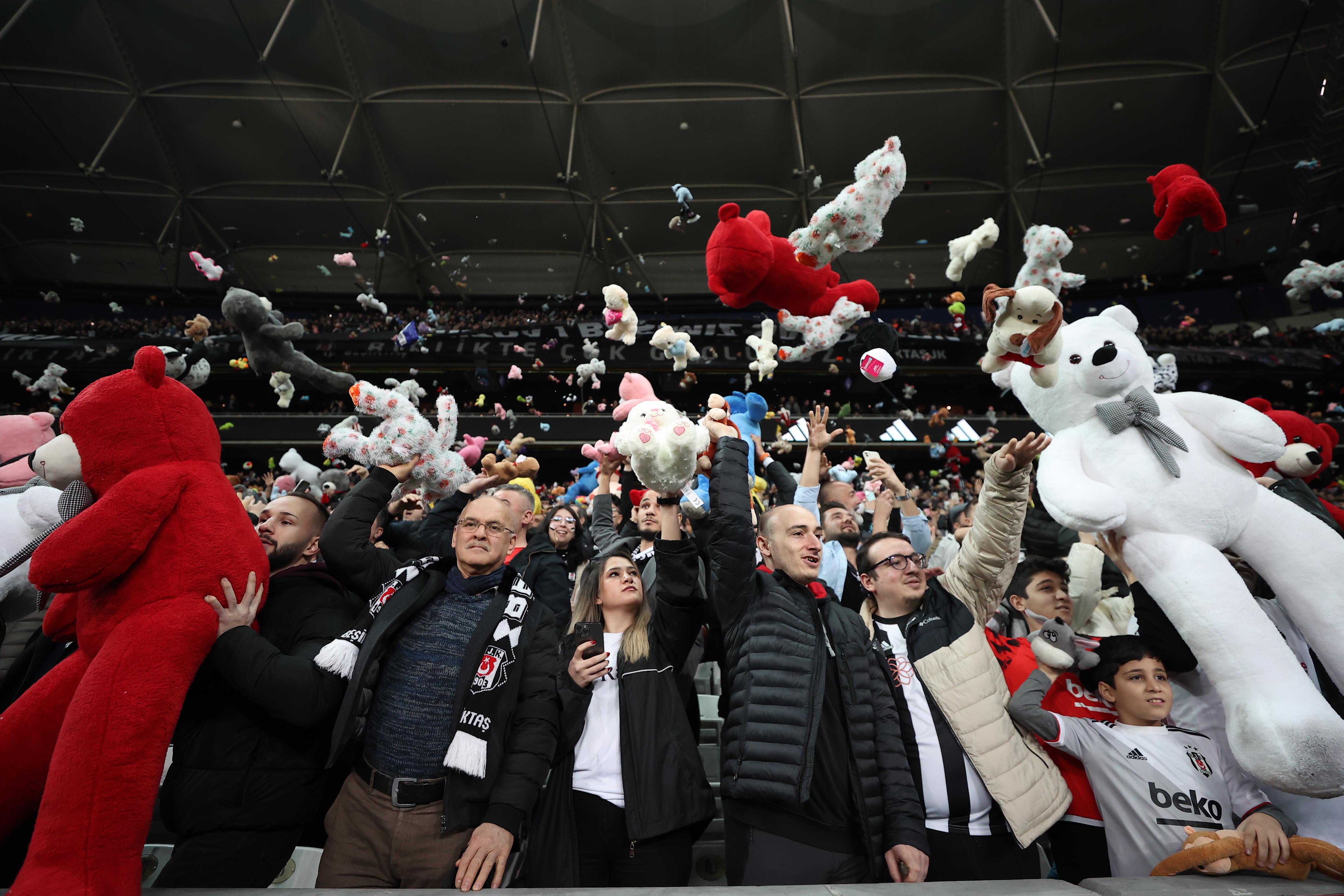 Fans of Turkish football club Beşiktaş have shown their support for children affected by the Türkiye and Syria earthquakes, showering the team's Istanbul pitch with thousands of stuffed toys.