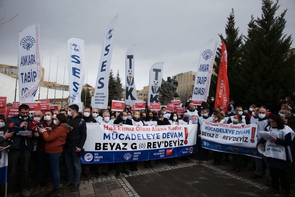 “We want our wages and personal rights to improve,” said Prof. Osman Kucukosmanoglu of the Turkish Medical Association during the protest in Istanbul. “We want an income with which we can live humanely. We are saying we can’t make ends meet.”