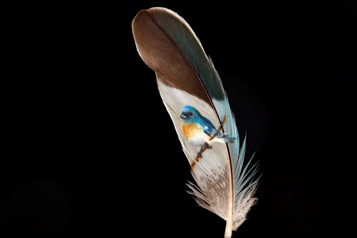Turkish micro artist Hasan Kale displays one of his art work on a feather at his office in Istanbul, Turkey, November 27, 2017. Picture taken November 27, 2017. REUTERS/Murad Sezer