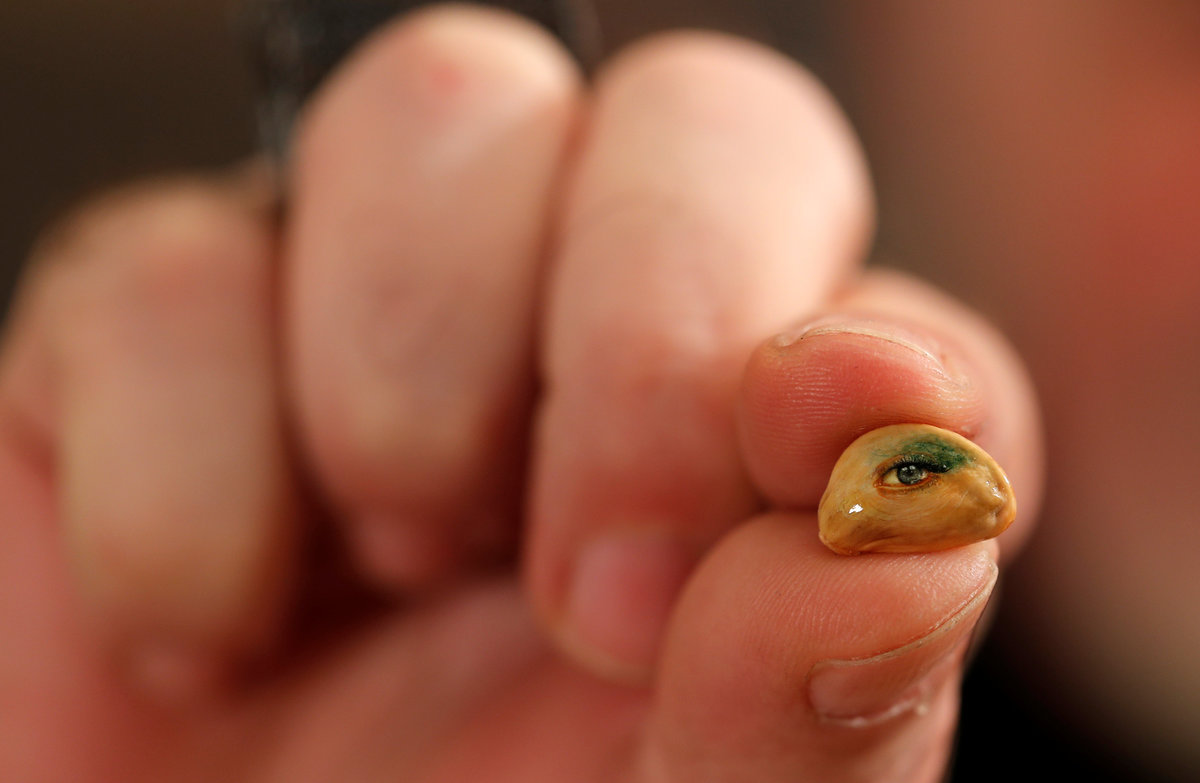 Turkish micro artist Hasan Kale works on a pumpkin seed at his office in Istanbul, Turkey, November 27, 2017. Picture taken November 27, 2017. REUTERS/Murad Sezer