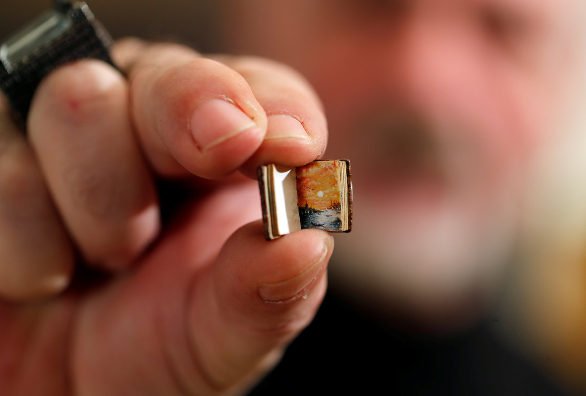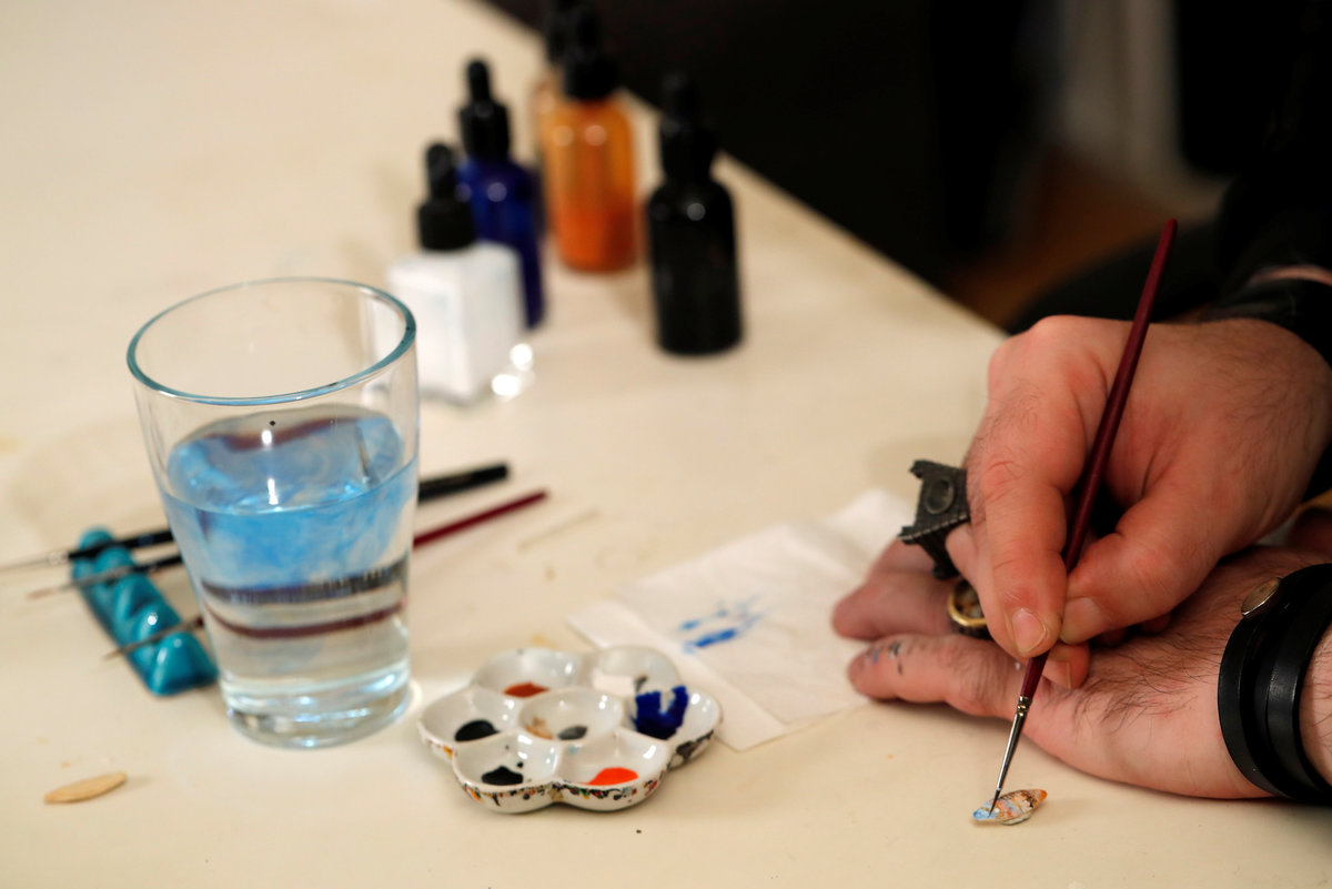 Turkish micro artist Hasan Kale displays one of his art work on a pine nut at his office in Istanbul, Turkey, November 27, 2017. Picture taken November 27, 2017. REUTERS/Murad Sezer Turkish micro artist Hasan Kale displays a miniature painting book at his office in Istanbul, Turkey, November 27, 2017. Picture taken November 27, 2017. REUTERS/Murad Sezer Turkish micro artist Hasan Kale poses in front of the historical Galata Tower in Istanbul, Turkey, November 27, 2017. Picture taken November 27, 2017. REUTERS/Murad SezerTurkish micro artist Hasan Kale displays one of his art work on a razor blade at his office in Istanbul, Turkey, November 27, 2017. Picture taken November 27, 2017. REUTERS/Murad Sezer Turkish micro artist Hasan Kale puts the final touches as he paints the historical Galata Tower on a pumpkin seed at his office in Istanbul, Turkey, November 27, 2017. Picture taken November 27, 2017. REUTERS/Murad SezerTurkish micro artist Hasan Kale works on a pumpkin seed at his office in Istanbul, Turkey, November 27, 2017. Picture taken November 27, 2017. REUTERS/Murad Sezer