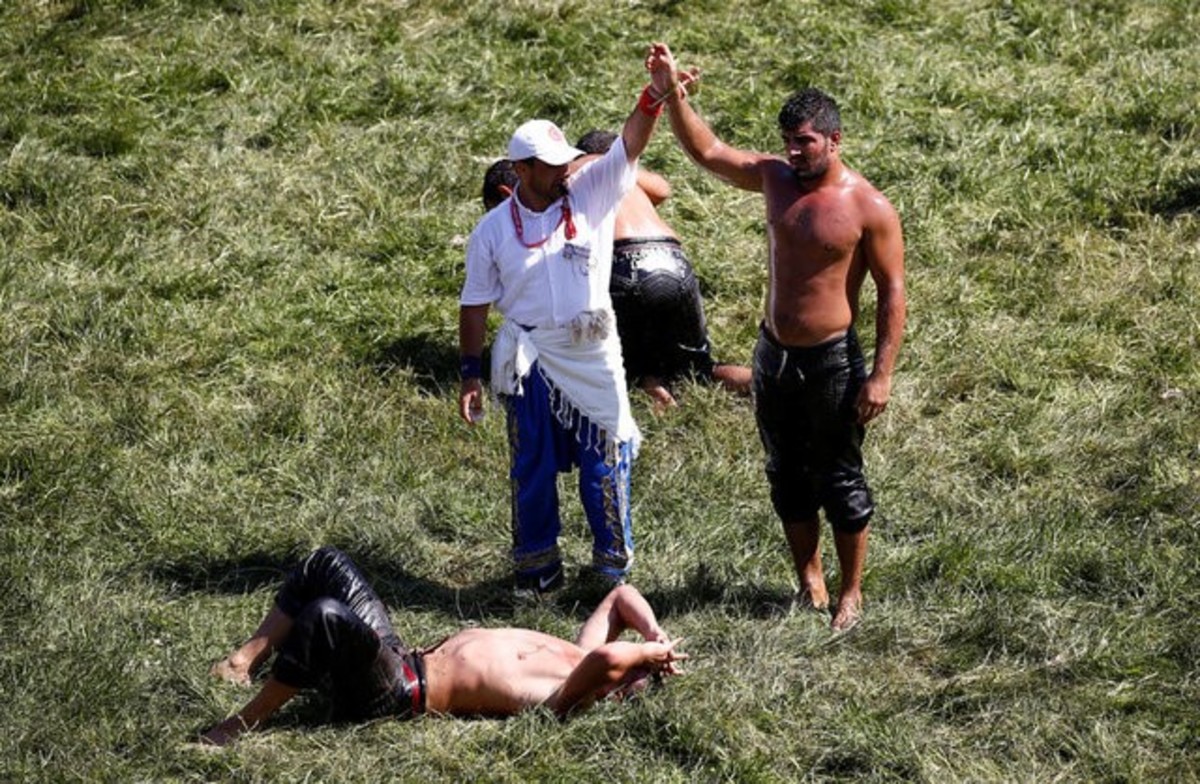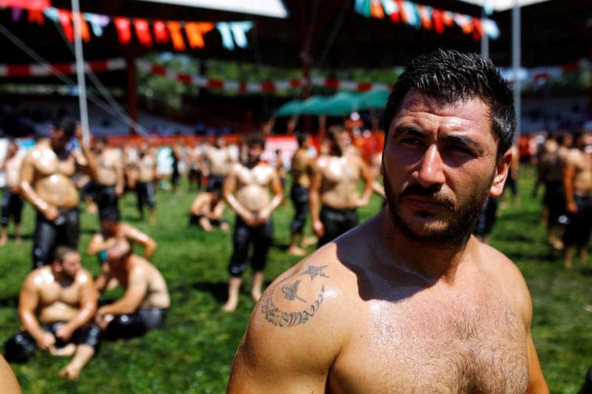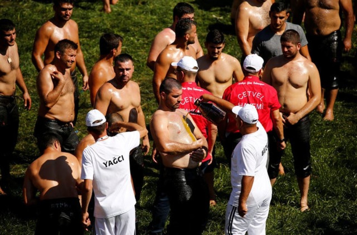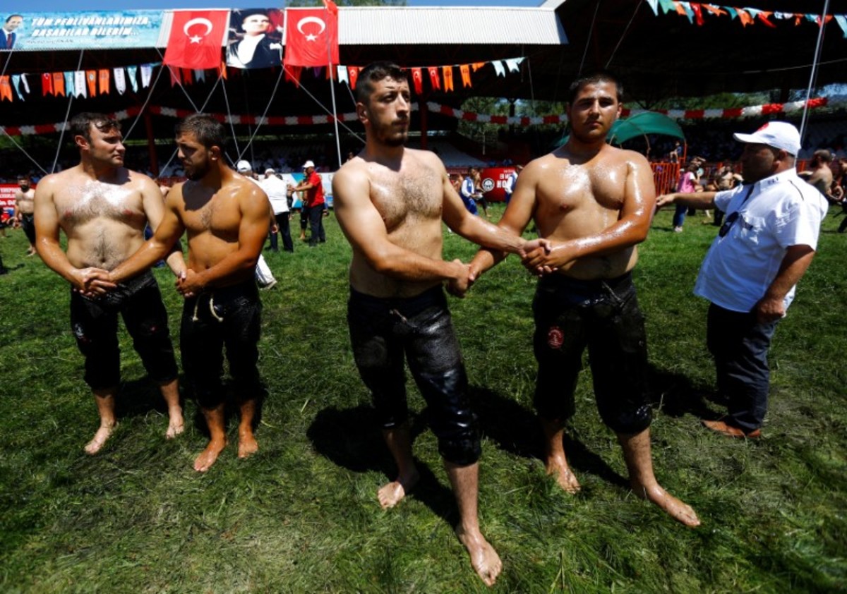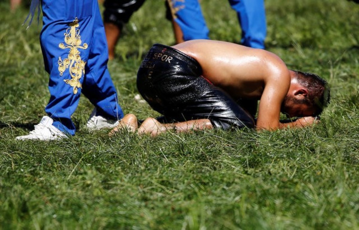 A wrestlers lies on the ground after being defeated by his opponent in the annual Kirkpinar oil wrestling tournament at the Sarayici arena in Edirne, Turkey July 14, 2017. REUTERS/Murad SezerUmit Kinali, 32, a bodyguard from Bodrum, waits to compete in the annual Kirkpinar oil wrestling tournament at the Sarayici arena in Edirne, Turkey July 14, 2017. REUTERS/Murad SezerA wrestler rubs his body with oil before competing in the annual Kirkpinar oil wrestling tournament at the Sarayici arena in Edirne, Turkey July 14, 2017. REUTERS/Murad SezerWrestlers wait to compete in the annual Kirkpinar oil wrestling tournament at the Sarayici arena in Edirne, Turkey July 14, 2017. REUTERS/Murad SezerWrestlers wait to compete in the annual Kirkpinar oil wrestling tournament at the Sarayici arena in Edirne, Turkey July 14, 2017. REUTERS/Murad SezerUmit Kinali, 32, a bodyguard from Bodrum, waits to compete in the annual Kirkpinar oil wrestling tournament at the Sarayici arena in Edirne, Turkey July 14, 2017. REUTERS/Murad SezerWrestlers compete in the annual Kirkpinar oil wrestling tournament at the Sarayici arena in Edirne, Turkey, July 14, 2017. REUTERS/Murad SezerWrestlers get ready to compete in the annual Kirkpinar oil wrestling tournament at the Sarayici arena in Edirne, Turkey July 14, 2017. REUTERS/Murad SezerA young wrestler gets ready to compete in the annual Kirkpinar oil wrestling tournament at the Sarayici arena in Edirne, Turkey July 14, 2017. REUTERS/Murad Sezer