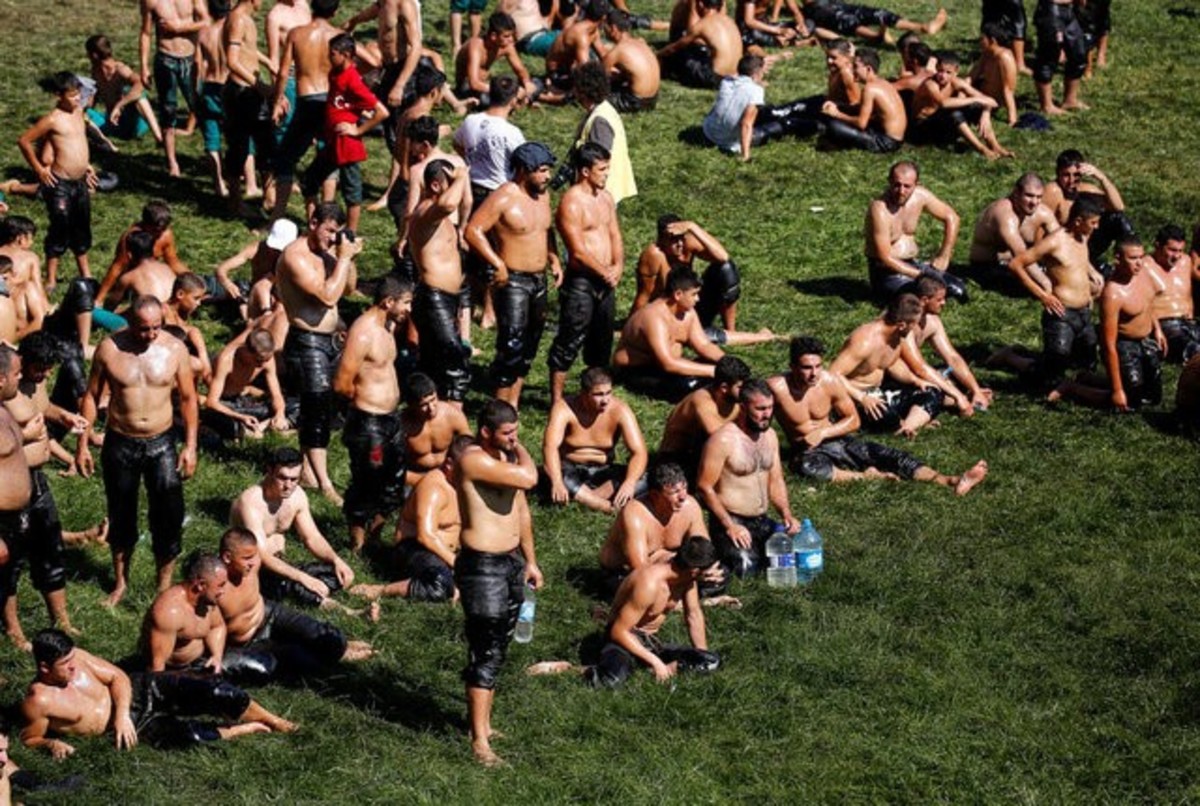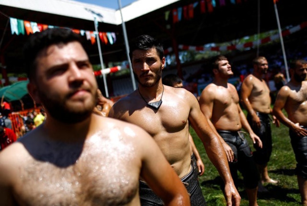 Wrestlers wait to compete in the annual Kirkpinar oil wrestling tournament at the Sarayici arena in Edirne, Turkey July 14, 2017. REUTERS/Murad Sezer