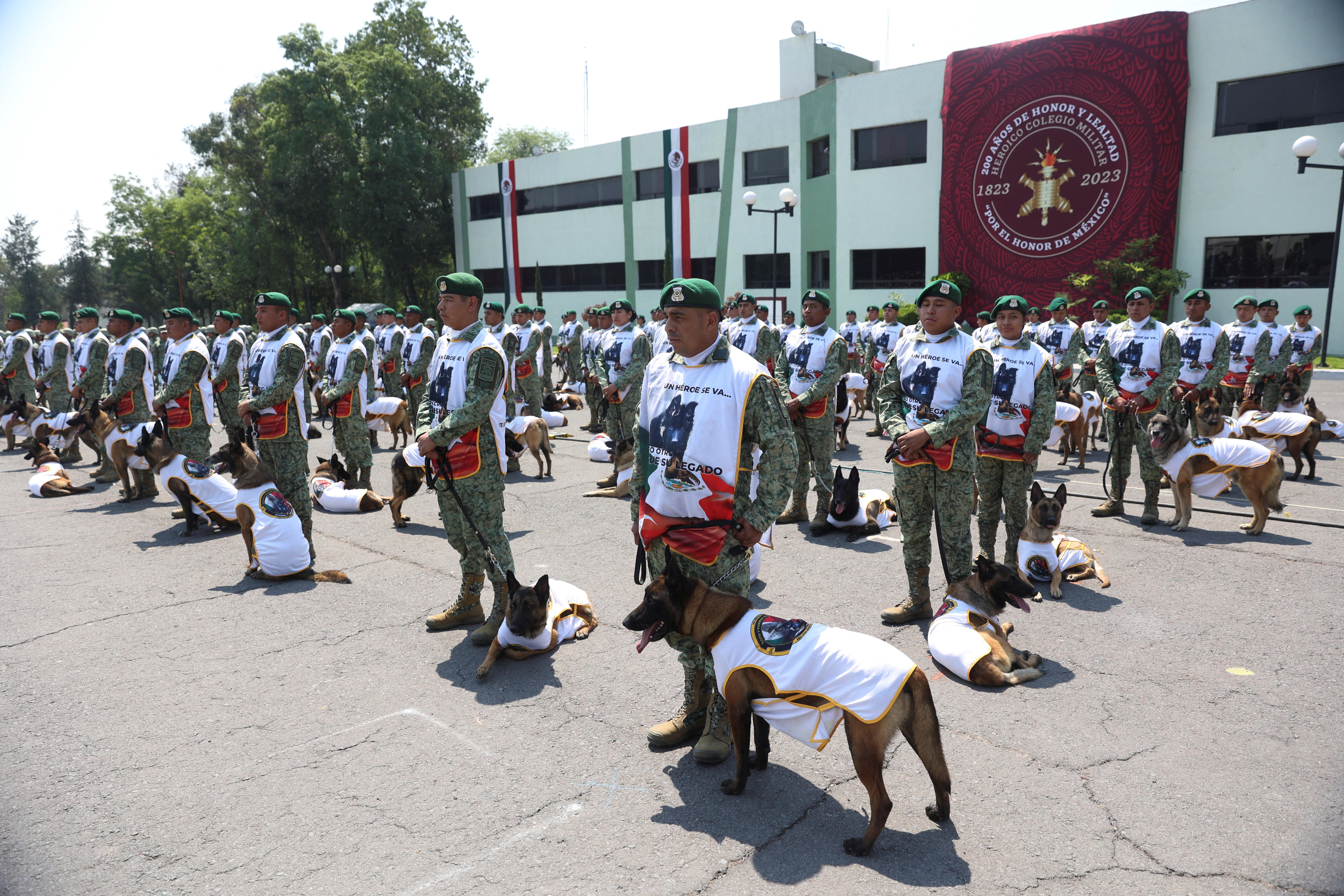 Wearing a padded green harness featuring a tiny Mexican flag, Arkadas was welcomed to the force in a formal ceremony at a military base in Mexico City on Wednesday, joined by his new canine and human colleagues who were standing to attention.