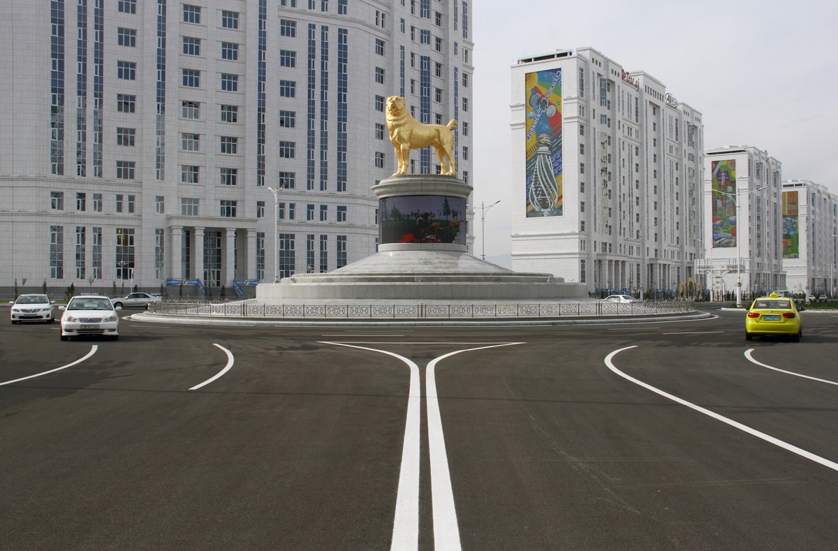 The statue, with a screen showing Turkmenistan's beloved Alabai dogs in action wrapped around the pedestal, joins another on a different major junction, also coated in gold, of President Kurbanguly Berdymukhamedov himself, seated on a horse.
