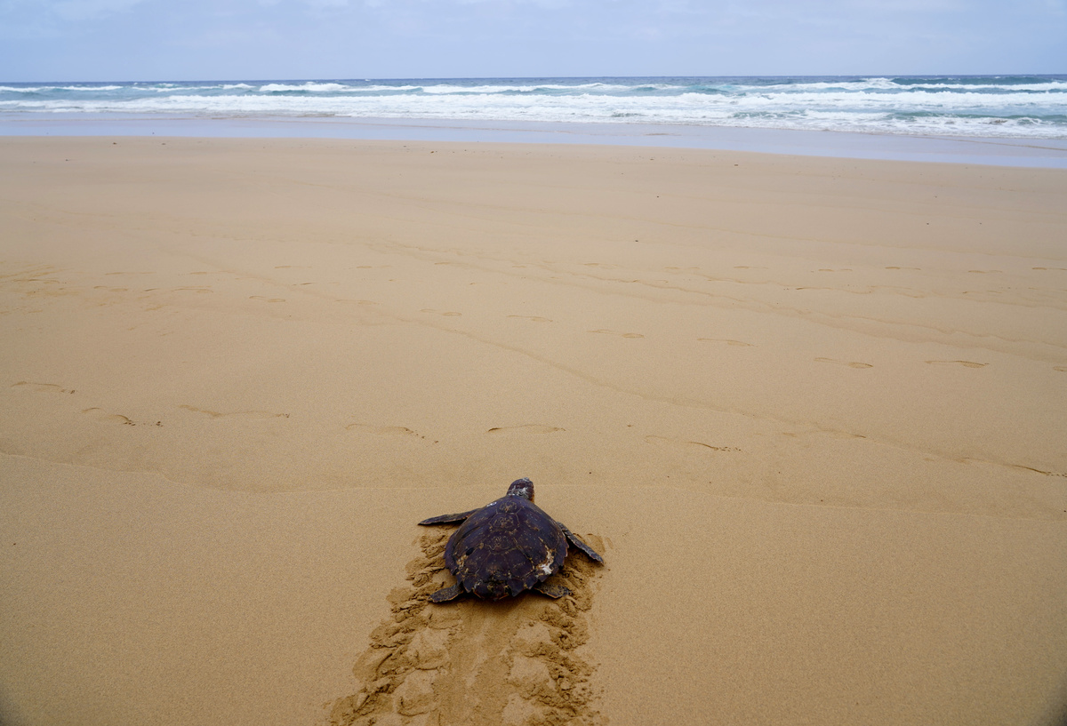 Free at last! Taking all the time in the world, a Loggerhead sea turtle ambles slowly back to the ocean and liberty.