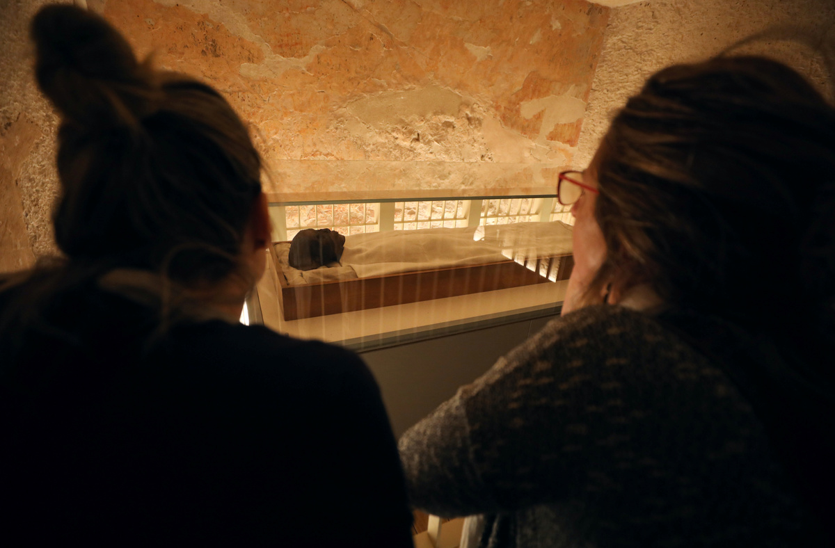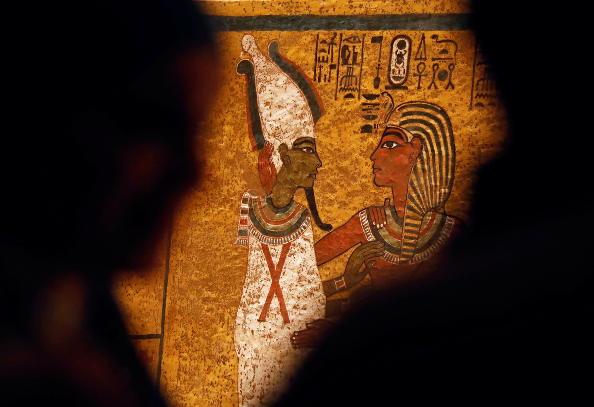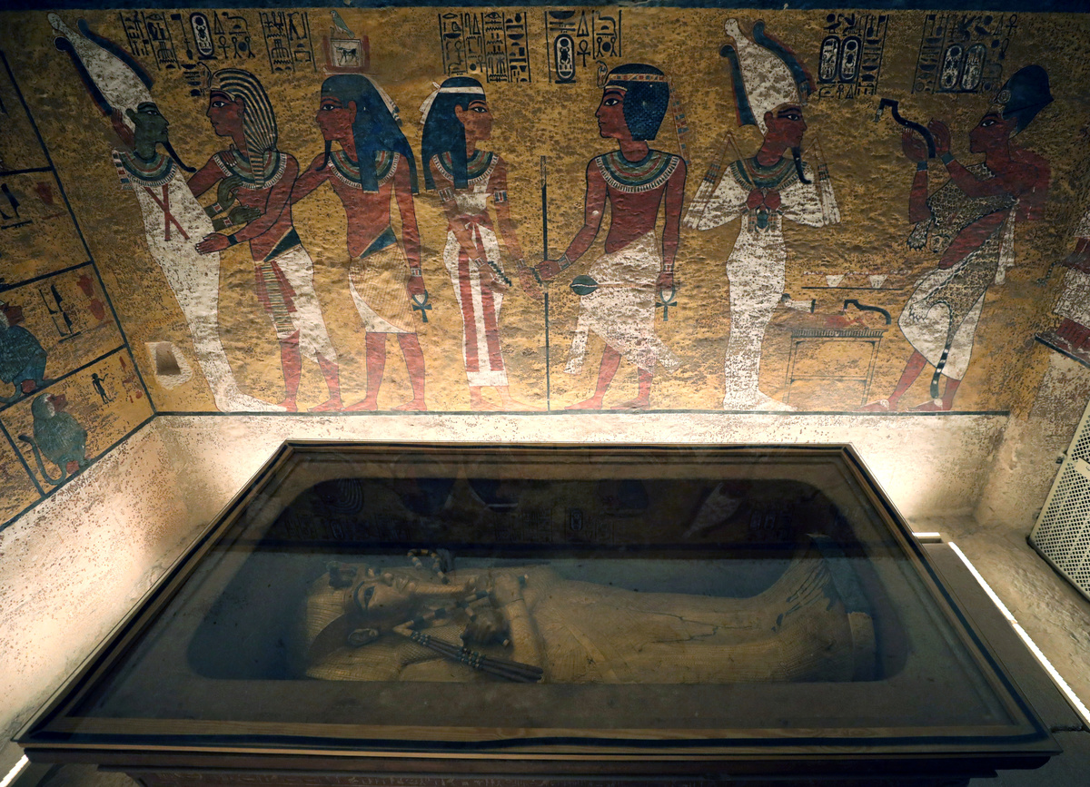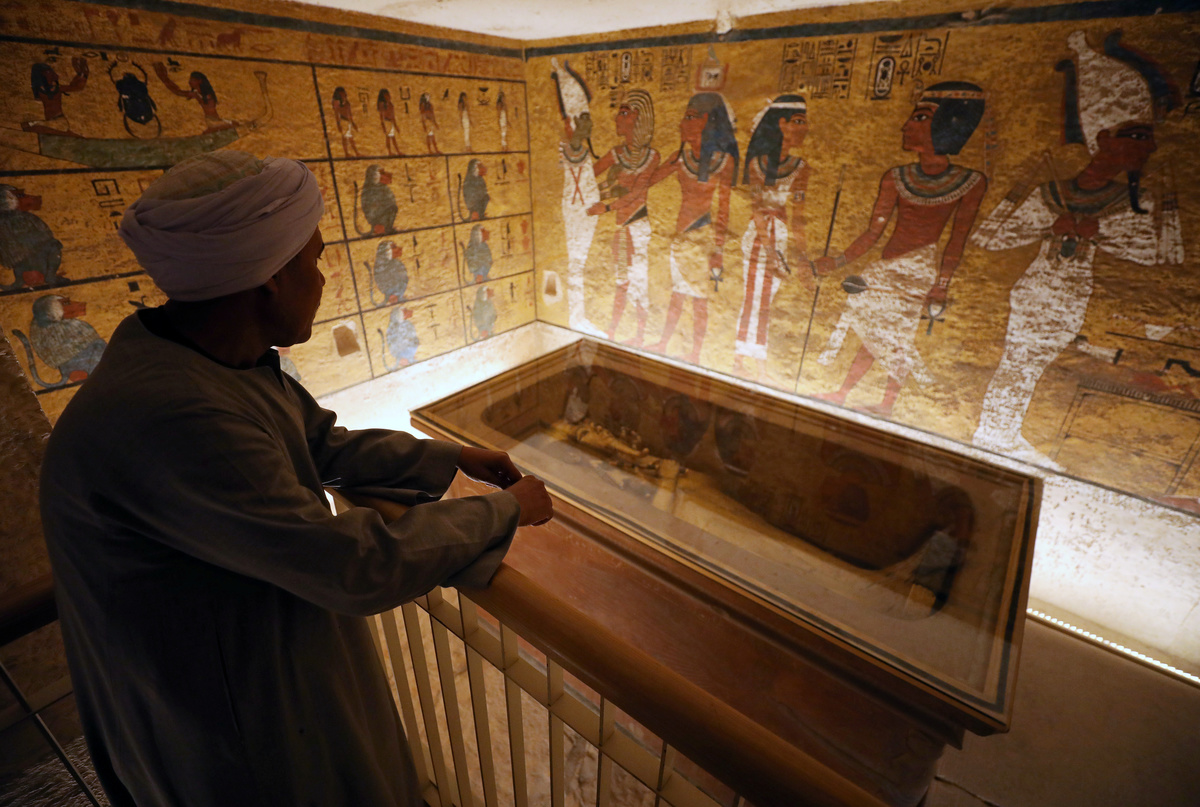 Visitors look at ancient Egyptian drawings on a wall of the newly renovated tomb of boy pharaoh King Tutankhamun in the Valley of the Kings in Luxor, Egypt January 31, 2019. REUTERS/Mohamed Abd El GhanyThe sarcophagus of boy pharaoh King Tutankhamun is on display in his newly renovated tomb in the Valley of the Kings in Luxor, Egypt January 31, 2019. REUTERS/Mohamed Abd El GhanyVisitors look at ancient Egyptian drawings on the newly renovated wall of boy pharaoh King Tutankhamun's tomb in Valley of the Kings in Luxor, Egypt January 31, 2019. REUTERS/Mohamed Abd El GhanyVisitors look at the mummy of boy pharaoh King Tutankhamun in his newly renovated tomb in the Valley of the Kings in Luxor, Egypt January 31, 2019. REUTERS/Mohamed Abd El GhanyThe sarcophagus of boy pharaoh King Tutankhamun is on display in his newly renovated tomb in the Valley of the Kings in Luxor, Egypt January 31, 2019. REUTERS/Mohamed Abd El GhanyAncient Egyptian drawings are seen on the newly renovated tomb wall of boy pharaoh King Tutankhamun in Valley of the Kings in Luxor, Egypt January 31, 2019. REUTERS/Mohamed Abd El GhanyAncient Egyptian drawings are seen on the newly renovated tomb wall of boy pharaoh King Tutankhamun in the Valley of the Kings in Luxor, Egypt January 31, 2019. REUTERS/Mohamed Abd El GhanyA guard looks at ancient Egyptian drawings and the sarcophagus in the newly renovated tomb wall of boy pharaoh King Tutankhamun in the Valley of the Kings in Luxor, Egypt January 31, 2019. REUTERS/Mohamed Abd El Ghany