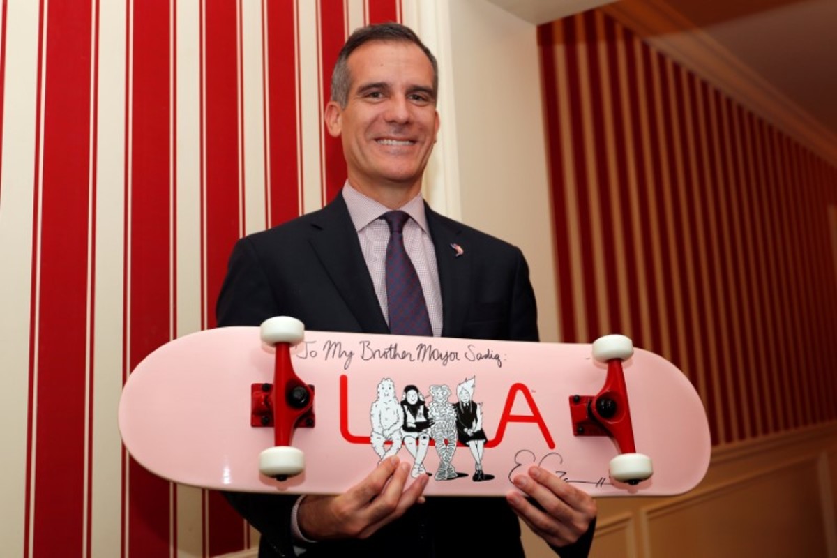 Los Angeles mayor Eric Garcetti shows off a skateboard he will offer to London Mayor Sadiq Khan during a two-day summit of the C40 Cities initiative, a network of cities making plans to cut planet-warming greenhouse gas emissions along levels agreed upon in Paris two years ago, in Paris, France, October 23, 2017. REUTERS/Charles Platiau