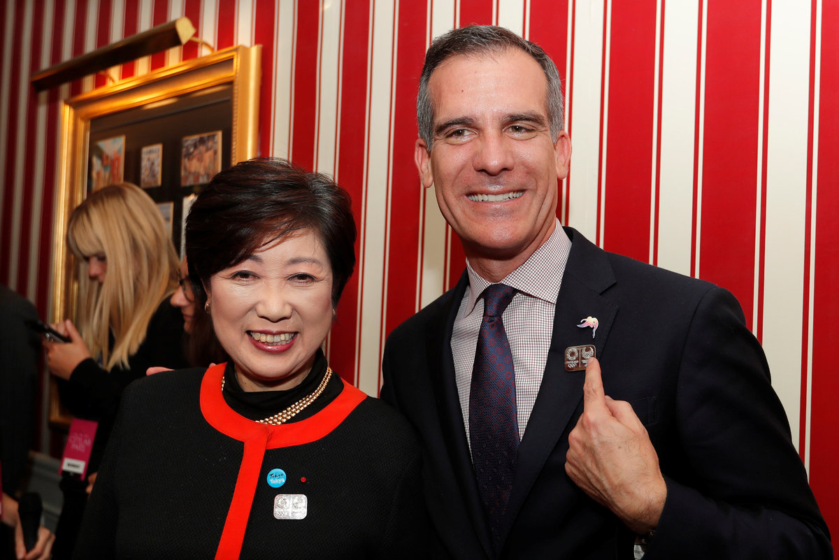 Los Angeles mayor Eric Garcetti (R) points at the Tokyo 2020 Olympics and Paralympics official pin he received from Tokyo Governor Yuriko Koike (L) during a two-day summit of the C40 Cities initiative, a network of cities making plans to cut planet-warming greenhouse gas emissions along levels agreed upon in Paris two years ago, in Paris, France, October 23, 2017. REUTERS/Charles Platiau