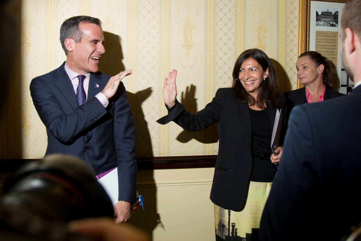Los Angeles mayor Eric Garcetti (L) says goodbye to Paris mayor Anne Hidalgo (R) after signing an agreement to share their expertises for the 2024 and 2028 Olympics Games during a two-day summit of the C40 Cities initiative, a network of cities making plans to cut planet-warming greenhouse gas emissions along levels agreed upon in Paris two years ago, in Paris, France, October 23, 2017. REUTERS/Charles Platiau