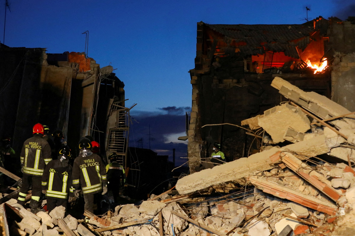 Members of a rescue team work at the scene of a gas explosion in a residential building, in Ravanusa, Italy, December 12, 2021. REUTERS/Guglielmo MangiapaneMembers of a rescue team work at the scene of a gas explosion in a residential building, in Ravanusa, Italy, December 12, 2021. REUTERS/Guglielmo MangiapaneMembers of a rescue team work at the scene where a four-storey building collapsed following a gas explosion, in Ravanusa, Italy, December 12, 2021. REUTERS/Antonio Parrinello TPX IMAGES OF THE DAYMembers of a rescue team work at the scene where a four-storey building collapsed following a gas explosion, in Ravanusa, Italy, December 12, 2021. REUTERS/Antonio ParrinelloA view of a damaged facade in the aftermath of a gas explosion in a residential building, in Ravanusa, Italy, December 12, 2021. REUTERS/Antonio ParrinelloEmergency services wheel away a victim after a four-storey building collapsed following a gas explosion in Ravanusa, Italy, December 12, 2021, in this still image from video. REUTERS TV