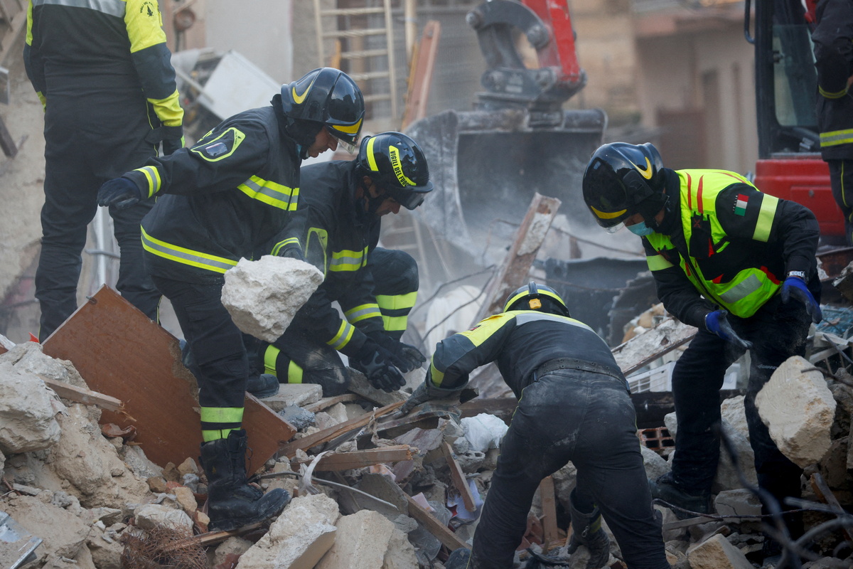 Members of a rescue team work at the scene of a gas explosion in a residential building, in Ravanusa, Italy, December 12, 2021. REUTERS/Guglielmo Mangiapane