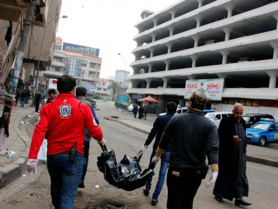 Civilians were left picking through debris as medics carried offcasualties after what is the deadliest Baghdad attack since the Isis killing of at least 40 people at a Shia festival in October.