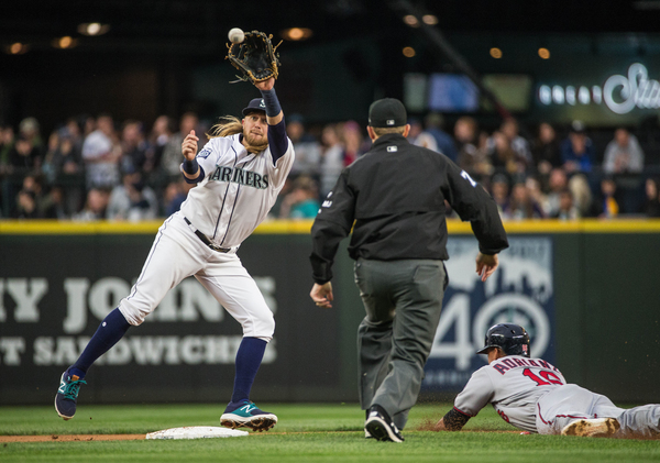 He then picked it up and fired a throw to third, hoping to get the runner leaning off the base. Instead, the throw skipped away from Kyle Seager.