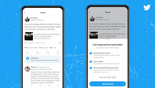 The feature, Twitter’s latest in an attempt to make conversation healthier on its hell app, will hit users with a warning that will appear below tweets that are receiving lots of engagement. “Heads up,” the message reads. “Conversations like this can be intense.” Twitter will also hit people with a pop-up message that basically is a desperate plea for civility: “ Let’s look out for each other,” it asks, with reminders to “remember the human,” “facts matter,” and “diverse perspectives have value.” Users will have to acknowledge these messages by tapping the “Count me in” button before resuming their regularly scheduled hate speech.