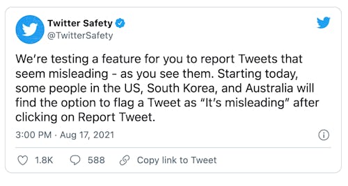 The new option is being tested in the U.S., South Korea, and Australia, and Twitter emphasizes it won’t be able to take action on every report in the experiment. But the information it obtains could help it to identify what types of information have the potential to go viral, so it can catch falsehoods earlier.