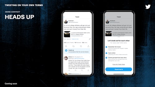 Now Twitter is in the early testing phase of a feature that would automatically warn users when they’re about to enter a particularly heated conversation. Called “Heads Up,” the feature presents users with a pop-up screen when they start replying to a conversation.