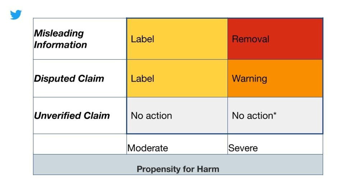 Twitter said it would not take action on tweets with information unconfirmed at the time of sharing, but it could place warnings or labels on disputed claims, as well as those confirmed as false.