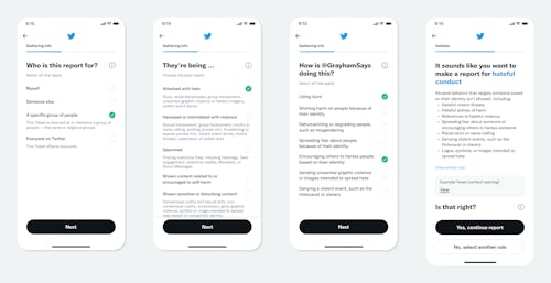 “The vast majority of what people are reporting on fall within a much larger gray spectrum that don't meet the specific criteria of Twitter violations,” said Renna Al-Yassini, a Senior UX Manager at Twitter, “but they're still reporting what they are experiencing as deeply problematic and highly upsetting.”