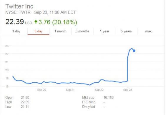 Twitter's stock has skyrocketed by more than 20 per cent in mid-morning trading on Friday.