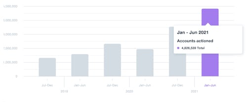 During the first half of 2021, Twitter took action against more than 4.8 million accounts — an enormous increase from the same period the year prior, when the company took action against just 1.9 million unique accounts. Most often (in about 1.6 million incidents) these actions pertained to violations of Twitter’s sensitive media policy, which essentially covers gory, violent, and sexually explicit content.
