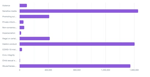 Sensitive media took the number-one spot again in relation to total content removed from Twitter, though hateful conduct and abuse/harassment gave it a run for its money. Those three categories comprised nearly 5 million content removal instances during the first half of 2021.