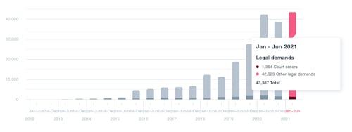 Twitter says it received more legal demands from governments around the world during this period than any other since it first began releasing transparency reports in 2012. More than 43,000 legal requests were filed between January and June of 2021, with more than 95 percent of those demands coming from Japan, Russia, Turkey, India, and South Korea. Japan topped the list with approximately 18,000 orders — about 43 percent of the period’s total.