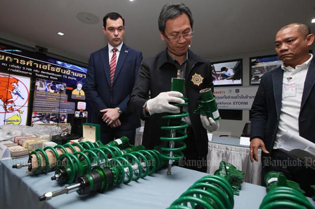 The Oncb chief said the two were arrested on Jan 17 when they showed up at the Suvarnabhumi airport cargo terminal to claim a returned parcel containing eight shock absorbers -- with 3,740 grammes of heroin hidden inside.