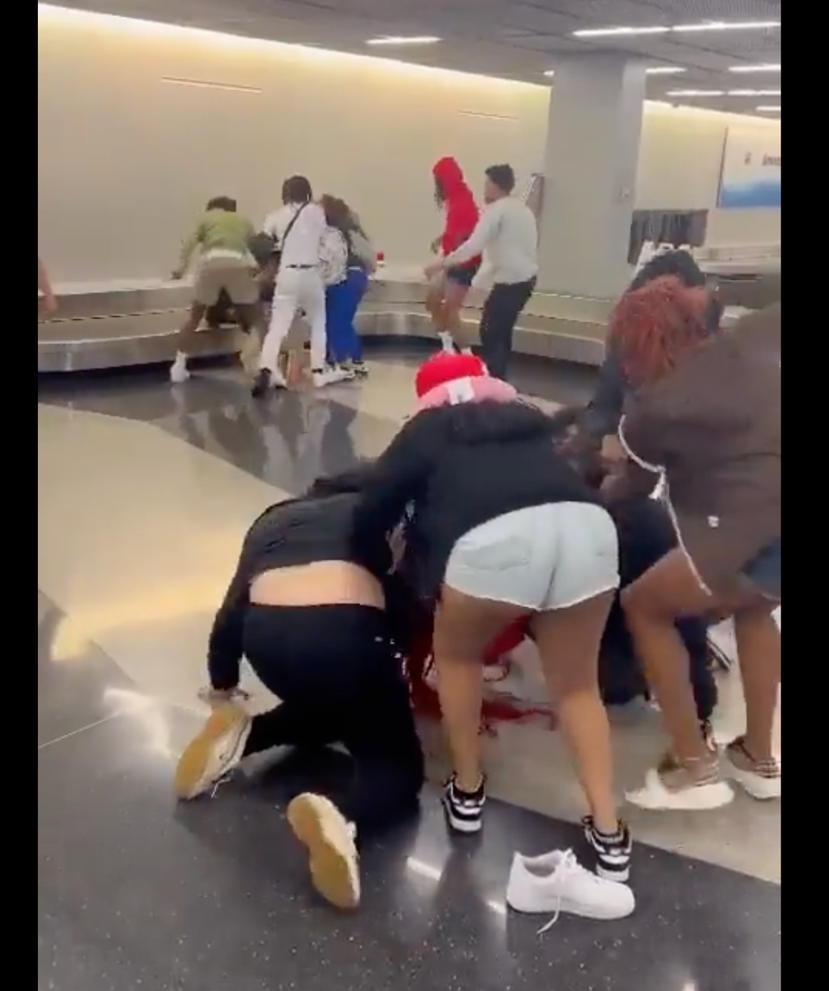 Shocking footage on social media shows roughly a dozen people involved in the commotion beside the baggage carousels in Terminal 3. Several women are grappling on the floor, violently kicking out and pulling each other’s’ hair, while in the background several men are seen tackling each other into the carousels and throwing punches and kicks.
