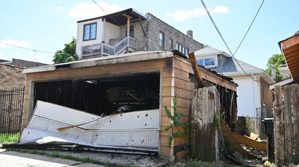 The garage of the home was severely burned, and a car inside had sustained damage from the fire. Burned wood was scattered along the side of the garage in the backyard.