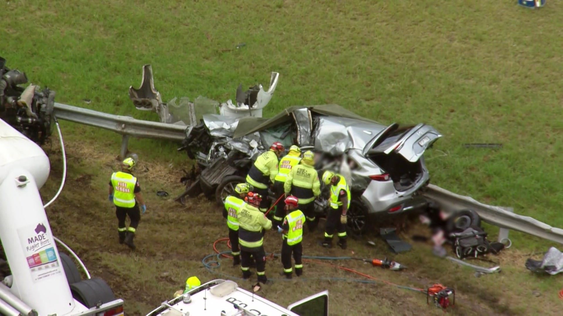 Emergency crews were called to the scene on the Hume Highway at Menangle Park, in the Macarthur region, at about 11.20am on Monday.