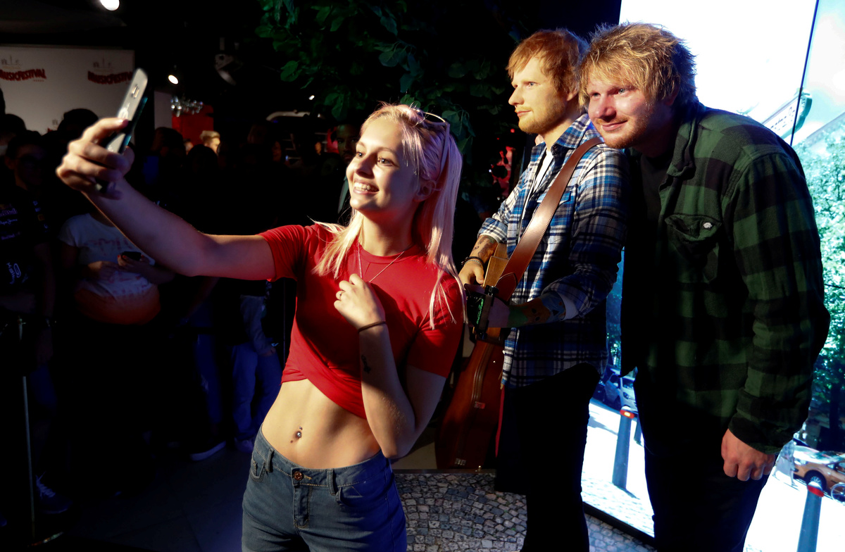 Eckl, with sunglasses covering his eyes, posed for photographers and fans with the waxwork of Sheeran, which was dressed in a blue checked shirt and featured some of the singer's arms tattoos plus a guitar.