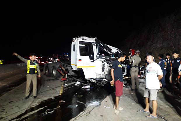 A police investigation revealed that the lorry was headed for Krabin Buri district. Running downhill on a sharp bend in front of the Chao Pho Khao Pu Thon shrine between Khao Yai and Thap Lan national parks, the brakes failed and the vehicle rammed into the rear of the lorry in front and overturned.